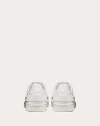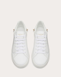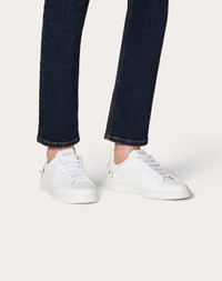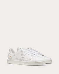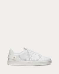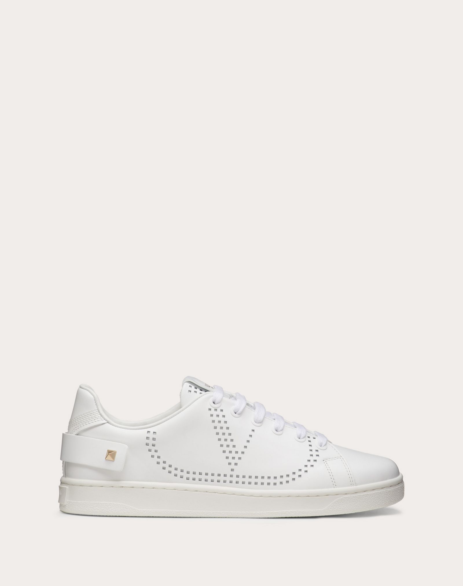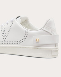 Valentino Garavani BACKNET sneaker in calfskin leather. - Side VLOGO embellishment in perforated leather with tonal sub-leather - Removable heel patch with snap buttons and embellished with platinum studs - Rubber sole - Made in Italy GIVE YOUR BACKNETS A NAME Valentino can personalize your sneakers with your initials. You can choose up to three letters to be stamped with a platinum-colored metallic foil on the removable patch on the back of each shoe.