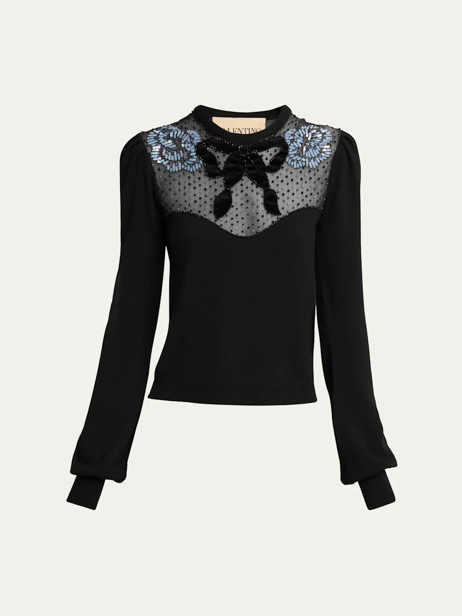 Valentino Garavani sheer bust sweater with bead and floral embroidery Crew neckline Long balloon sleeves Relaxed fit Pullover style Virgin wool Made in Italy Online Inquiries: BGS21_B9XTN| Store Inquiries: #4996682