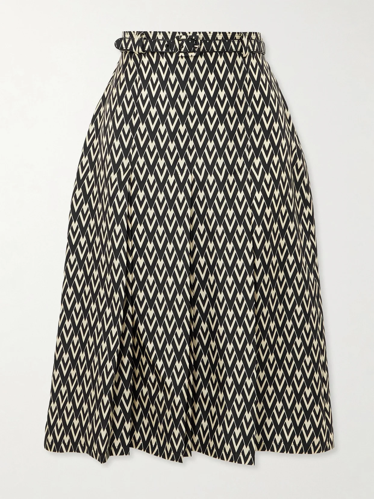 Valentino Garavani's midi skirt has a bold geometric print - look closer and you'll notice it's made up of the house's signature 'V'. It's been made in Italy from fluid silk-twill, pressed with pleats for movement and features a coordinating waist belt. Go for a maximalist look and style with the matching blouse from the collection.