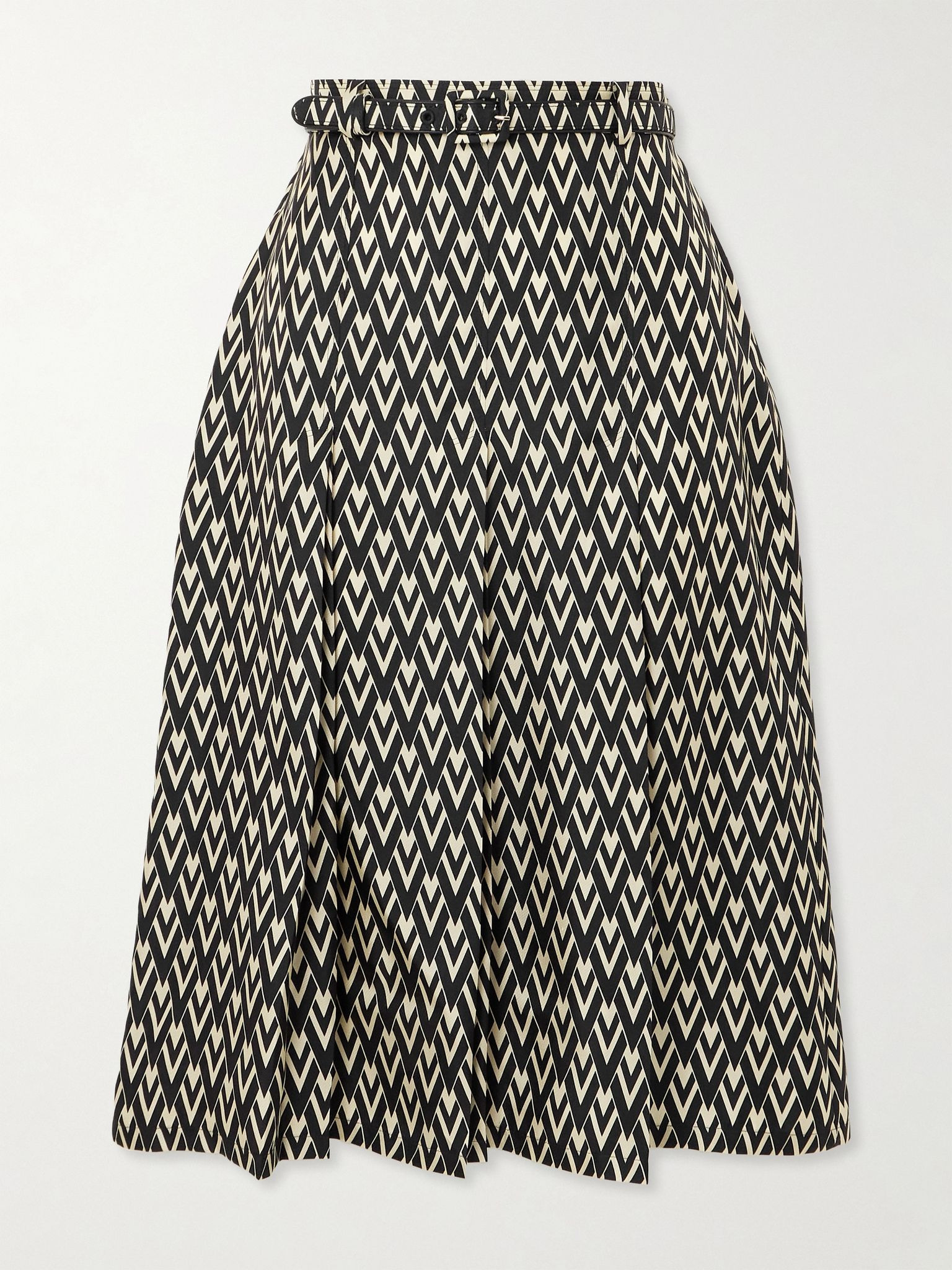 Valentino Garavani's midi skirt has a bold geometric print – look closer and you'll notice it's made up of the house's signature 'V'. It's been made in Italy from fluid silk-twill, pressed with pleats for movement and features a coordinating waist belt. Go for a maximalist look and style with the matching blouse from the collection. Details & Care - Black and cream silk-twill - Concealed zip fastening along side - 100% silk - Dry clean