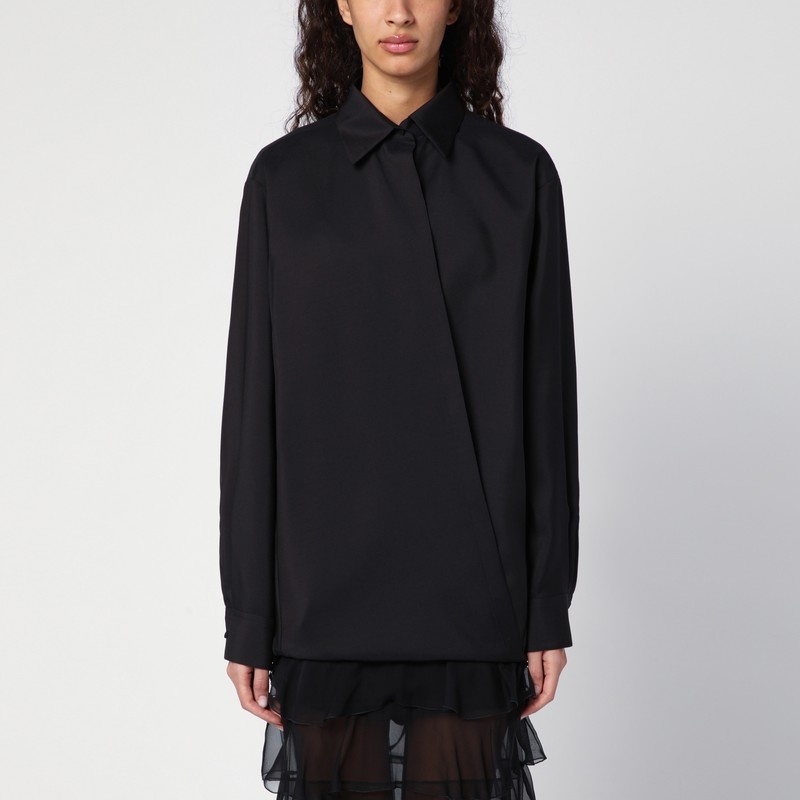Black wool, mohair and silk shirt by Valentino featuring a classic collar, long sleeves with buttoned cuffs, drawstring at the bottom of the garment and cross-over placket at the front.