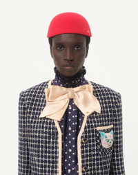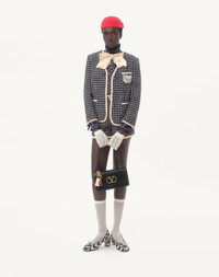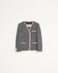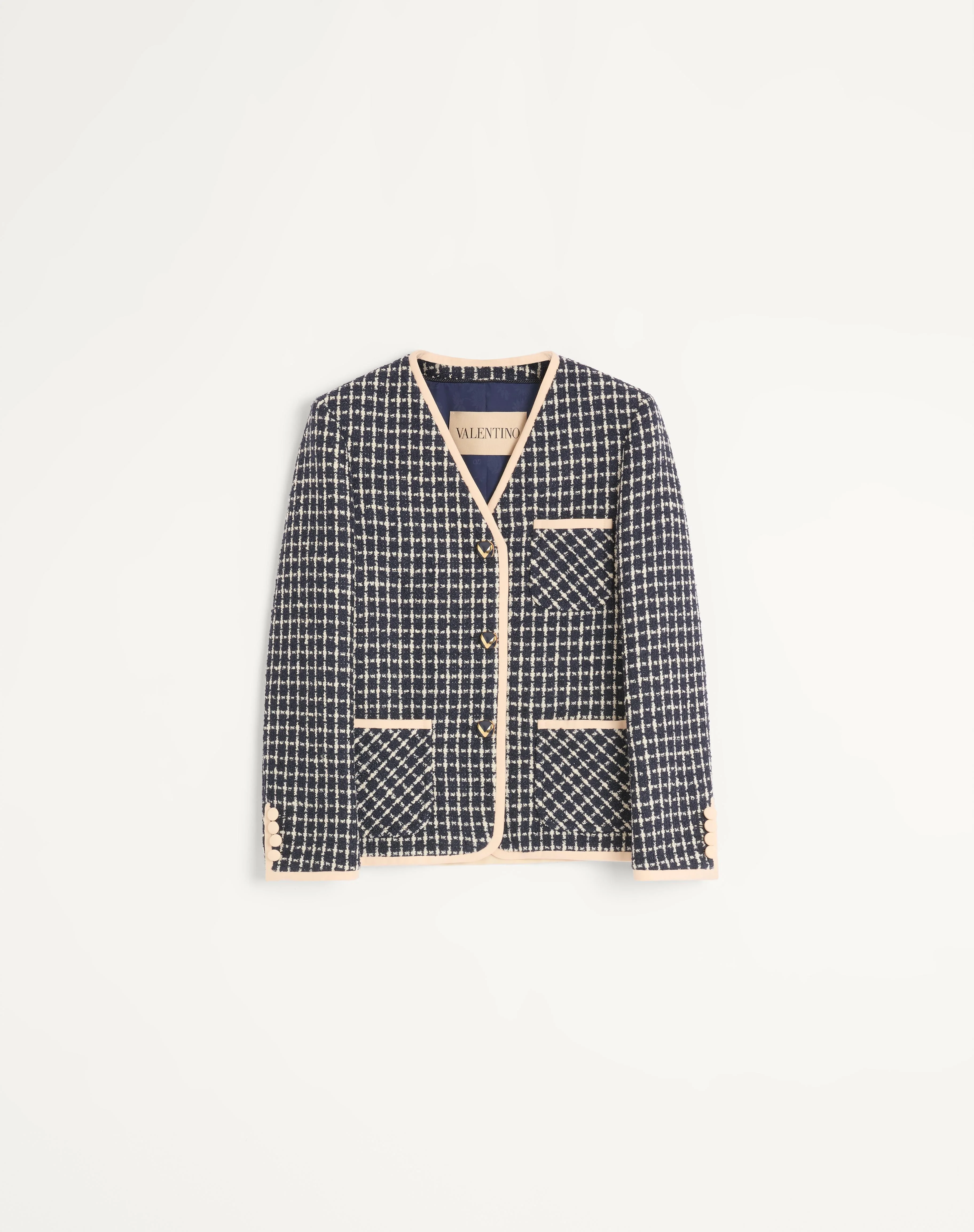 Boucle jacket with contrasting Crepe Couture details - Front closure with VLogo buttons - Boucle square (77% Virgin Wool, 17% Cotton, 6% Polyamide) - Jacquard Fiore VLogo lining (75% Acetate, 25% Silk) - Length: 60 cm / 23.6 in. from the shoulders in an Italian size 40 - The model is 176 cm / 5'9" tall and wears an Italian size 40 - Made in Italy The look of the model is completed by a Valentino Garavani Vain Bag and Valentino Garavani Adamantine Shoes. Product code: 7B3CE4H09E4_671