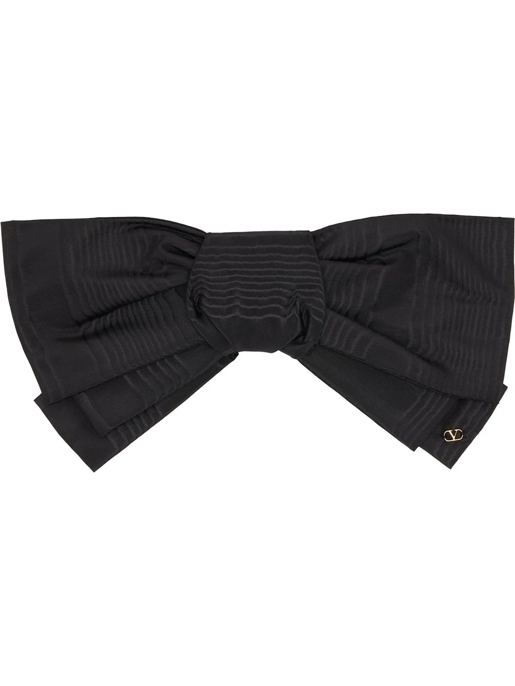 Moire brooch in black. · Bow with logo hardware at face · Safety-pin fastening · Gold-tone brass hardware · H5" x W10" Supplier color: Nero/Oro Textile, brass. Made in Italy 252807F021000
