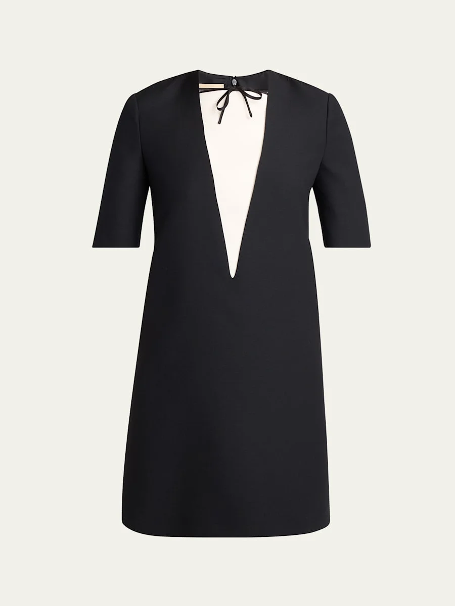 This woolblend dress from Valentino Garavani is designed for a layered effect, creating the illusion of a highneck bow top under a plunging V neckline High neckline Elbowlength sleeves Hem falls above the knee Shift silhouette Center back zipper Virgin wool/silk Made in Italy
