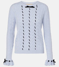 Add charm to your collection with this sweater from Valentino. Expertly knitted from soft virgin wool, the cable-knit style is enriched with velvet bow detailing. Product Details - Material: 100% virgin wool - Care instructions: dry clean - Made in Italy - Designer color name: Angel Blue - Item color: blue - Trim: 56% cotton, 44% viscose - Collar: crewneck - Cuff: ruffled - Hem: ribbed - Item number: P01059832 Size & Fit - True to size - Straight fit - Slightly stretchy fabric - Falls to the hip - The model seen in the picture is 178cm-5'10" and wearing a size XS