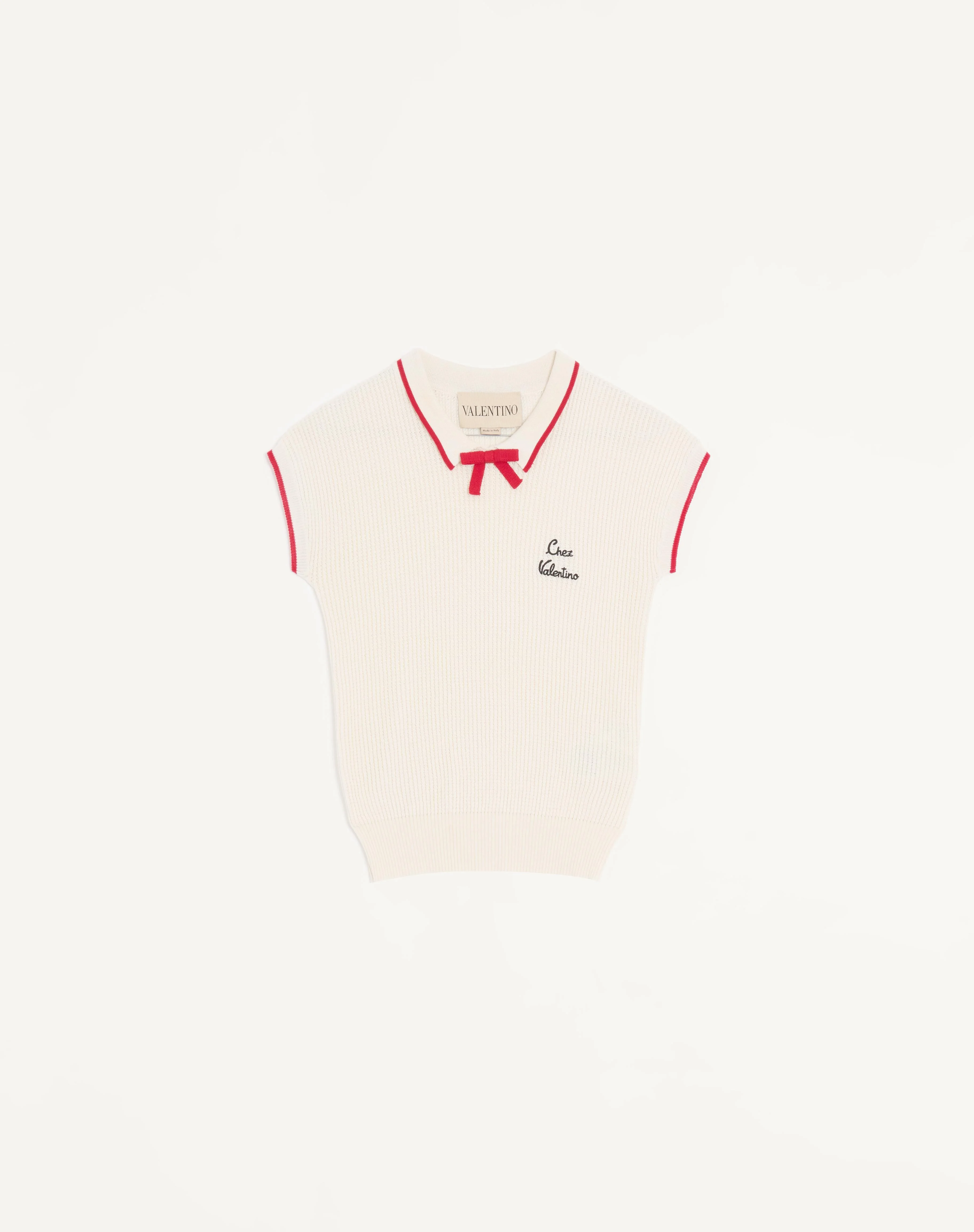Chez Valentino Cotton Top - Bow detail on the collar - Cotton and Viscose (54% Cotton, 46% Viscose) - Length: 54 cm / 21.3 in. from the shoulders in an Italian size S - The model is 176 cm / 5'9" tall and wears an Italian size S - Made in Italy The look of the model is completed by a Valentino Garavani Viva Superstar Bag and Valentino Garavani Hotty Shoes. Product code: 8B3KC66T9JV_BRS