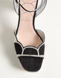 Valentino Garavani Bowow platform sandal in moire fabric with crystal appliques and scallop motif - Adjustable ankle strap - VLogo Signature detail with antique-effect brass finish - Heel detailed with crystals and scallop motif - Fabric-covered platform and block heel - Custom insole with scallop motif - Heel height: 115 mm / 4.5 in. with 45 mm / 1.8 in. platform - Made in Italy Product code: 7W2S0LY1CQG_R2D