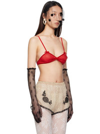 Semi-sheer silk chiffon bra. · Velvet trim throughout · V-neck · Bow appliques at front · Fixed spaghetti straps · Hook-eye fastening at back Supplier color: Paris Body: 100% silk. Trim: 90% viscose, 10% polyamide. Made in Italy 251476F073001