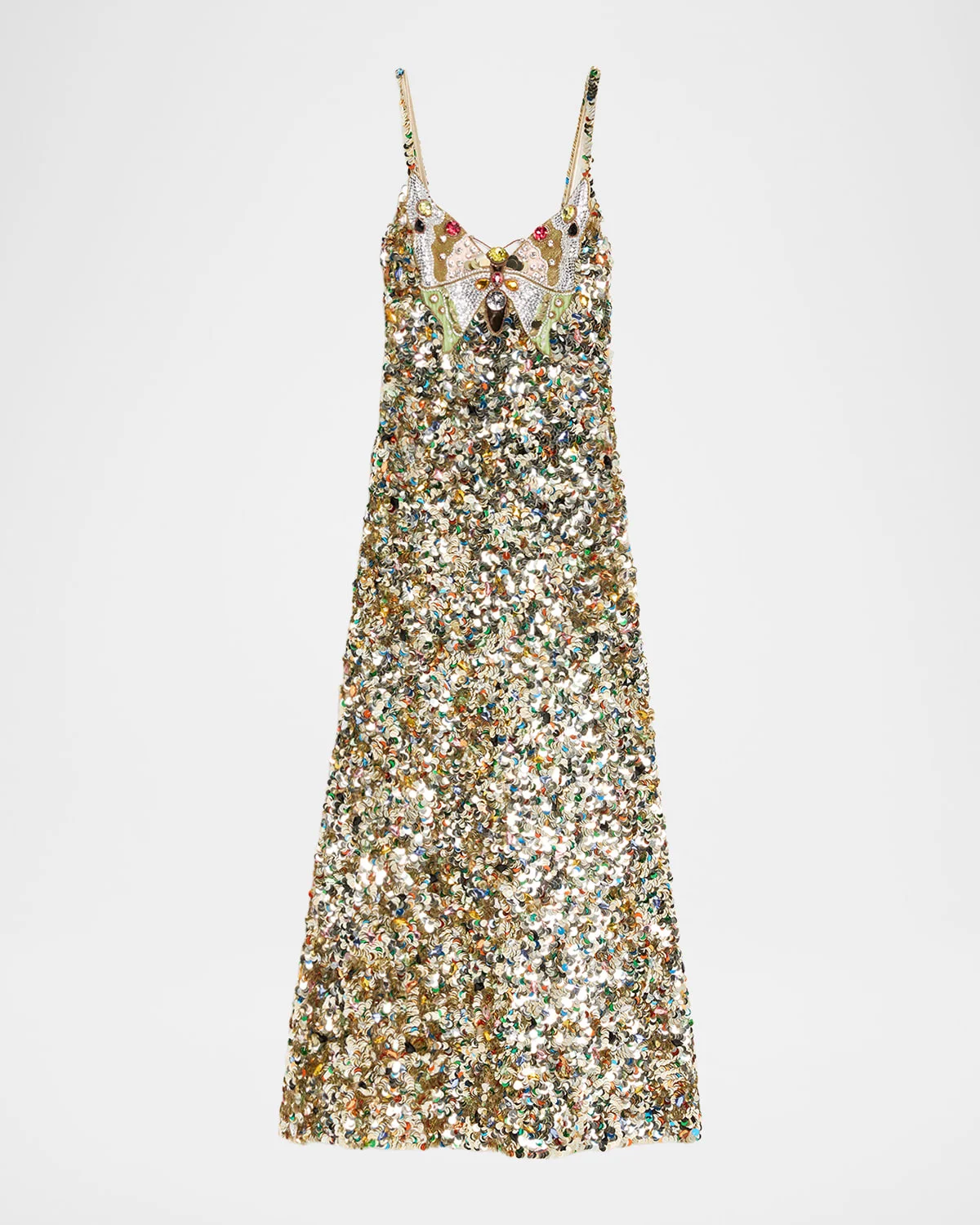 Crafted from sequined silk tulle, this dress from Valentino Garavani features a crystal bead embroidered butterfly on the chest V neckline Sleeveless Aline silhouette Full length Invisible back zip Silk Made in Italy