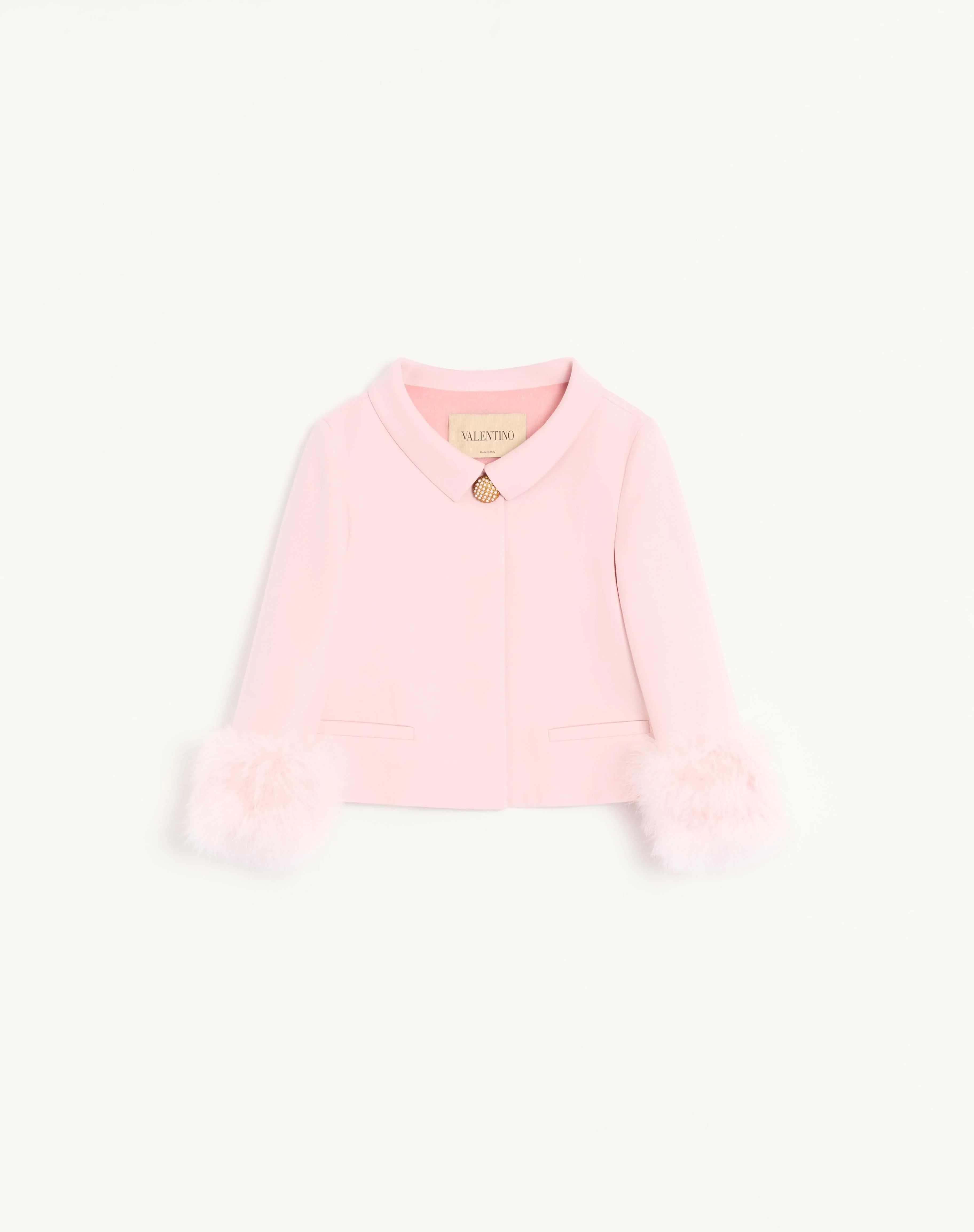 Crepe Couture jacket with feather boa at the wrists - Jewel button detail with beads - Front closure with snap buttons - Crepe Couture (65% Virgin Wool, 35% Silk) - Lining with flowers, stripes and VLogo (74% Acetate, 26% Silk) - The model is 176 cm / 5'9" tall and wears an Italian size 40 - Made in Italy The look of the model is completed by a Valentino Garavani Laseine Bag and Valentino Garavani Hotty Shoes. Product code: 8B3CE5Y01CF_R13
