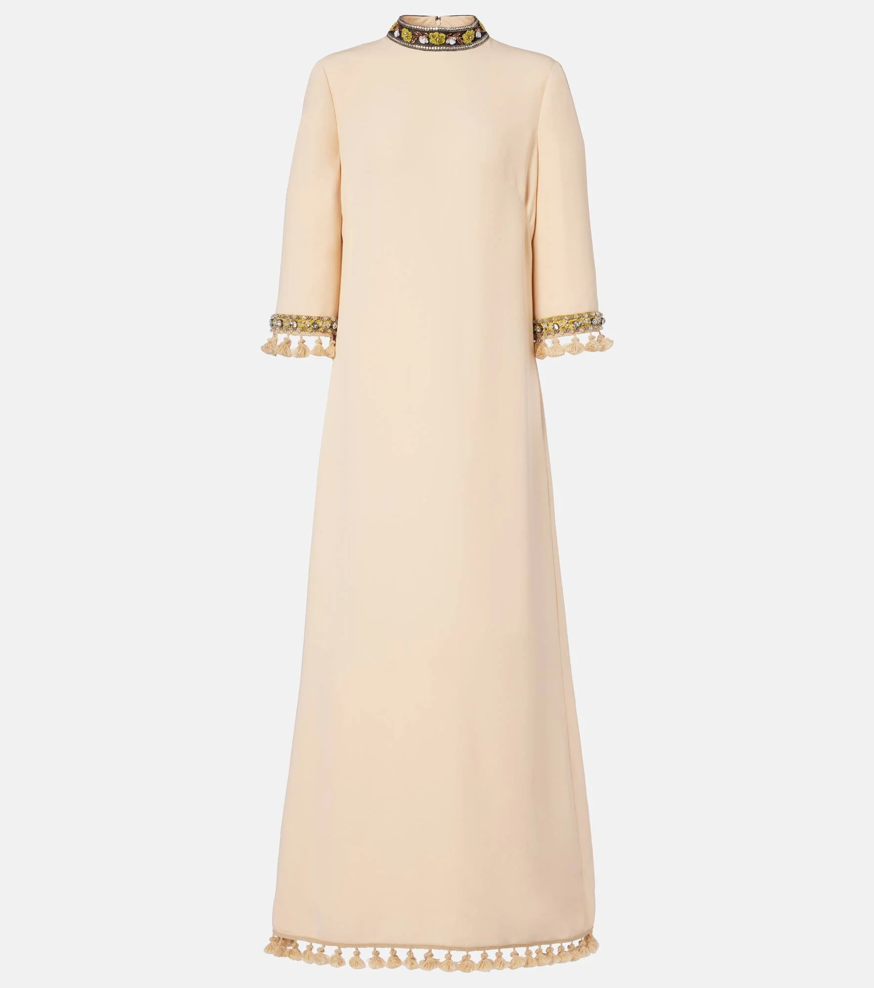 Made from swathes of pure silk, Valentino's signature Cady Couture lends fluidity to each style. This beautiful gown features a clean, A-line silhouette and is finished with floral embellished trims and soft tassels swinging from the hemline and sleeves. Product Details - Material: 100% silk - Care instructions: dry clean - Made in Italy - Designer color name: Betulla/Multicolor - Item color: beige - Material II: 100% silk - Material III: 100% silk - Lining: 100% silk - Embroidery: 39% metallic fibres, 35% polyamide, 26% other fibres - Details: 100% polyester - Trim: 75% viscose, 25% wool - Insert: 100% cotton - Material IV: 98% cotton, 1% elastane, 1% polyamide - Includes: dust bag - Item number: P01060208 Size & Fit - True to size - Designed for a loose fit - Non-stretchy fabric - The model seen in the picture is 178cm-5'10" and wearing a size IT 40