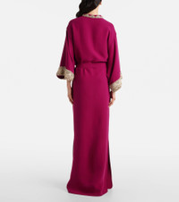 Product Details - Material: 100% silk - Care instructions: dry clean - Made in Italy - Designer color name: Phalaris Magenta/Gold/Silver - Comes with garment bag - Detachable band - Closure: hook fastening - Embroidery: 100% polyester - Item number: P01006417 Size & Fit - True to size - Dropped shoulders - Loose fit, comes with belt - Non-stretchy fabric - The model seen in the picture is 178cm-5'10" and wearing a size IT 40