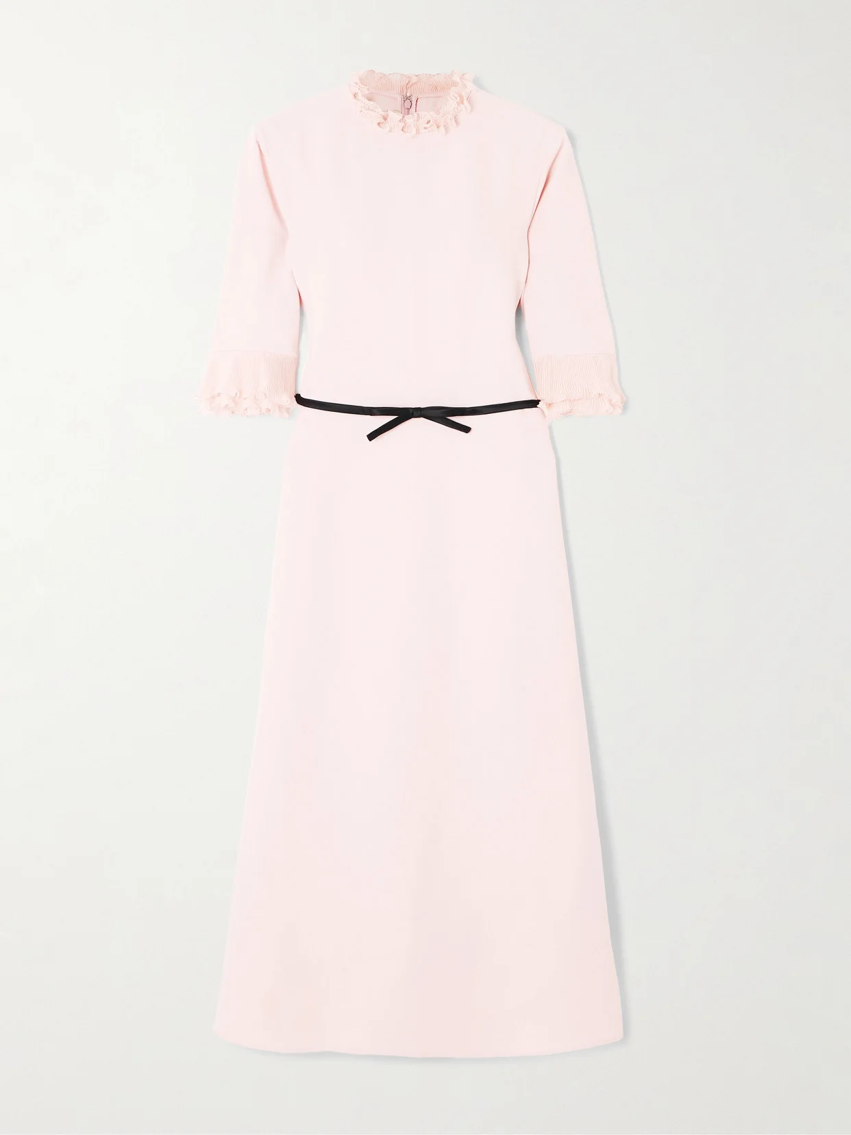 Valentino Garavani's midi dress evokes a sense of modest femininity, rendered with the subtle sophistication and timeless elegance the house is known for. It's made from baby-pink crepe and has plisse-chiffon ruffles along the neck and cuffs. The contrasting bow highlights and defines your waist.