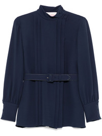 cady belted blouse Highlights - Valentino ready to wear - Indigo blue - Button fastening at the shoulder - Buttoned-cuff sleeves - Pleat detailing Made in Italy Composition Silk 100%, Calf Leather 100%, Viscose 91%, Elastane 9% SIZE & FIT Model measurements Height 5 ft 10 in(1.78 m) Bust/Chest 33.46 in(85 cm) Hips 36.22 in(92 cm) Waist 23.22 in(59 cm) Measurement SLEEVE LENGTH 24.8 in(63 cm) HIPS 43.3 in(110 cm) LENGTH 28.34 in(72 cm) WAIST 40.15 in(102 cm) FittingInformation Designed to be unstructured, offering a loose fit throughout The belt offers adjustability for fitted preferences Made from a midweight non-stretch fabric, this piece offers minimal elasticity when worn
