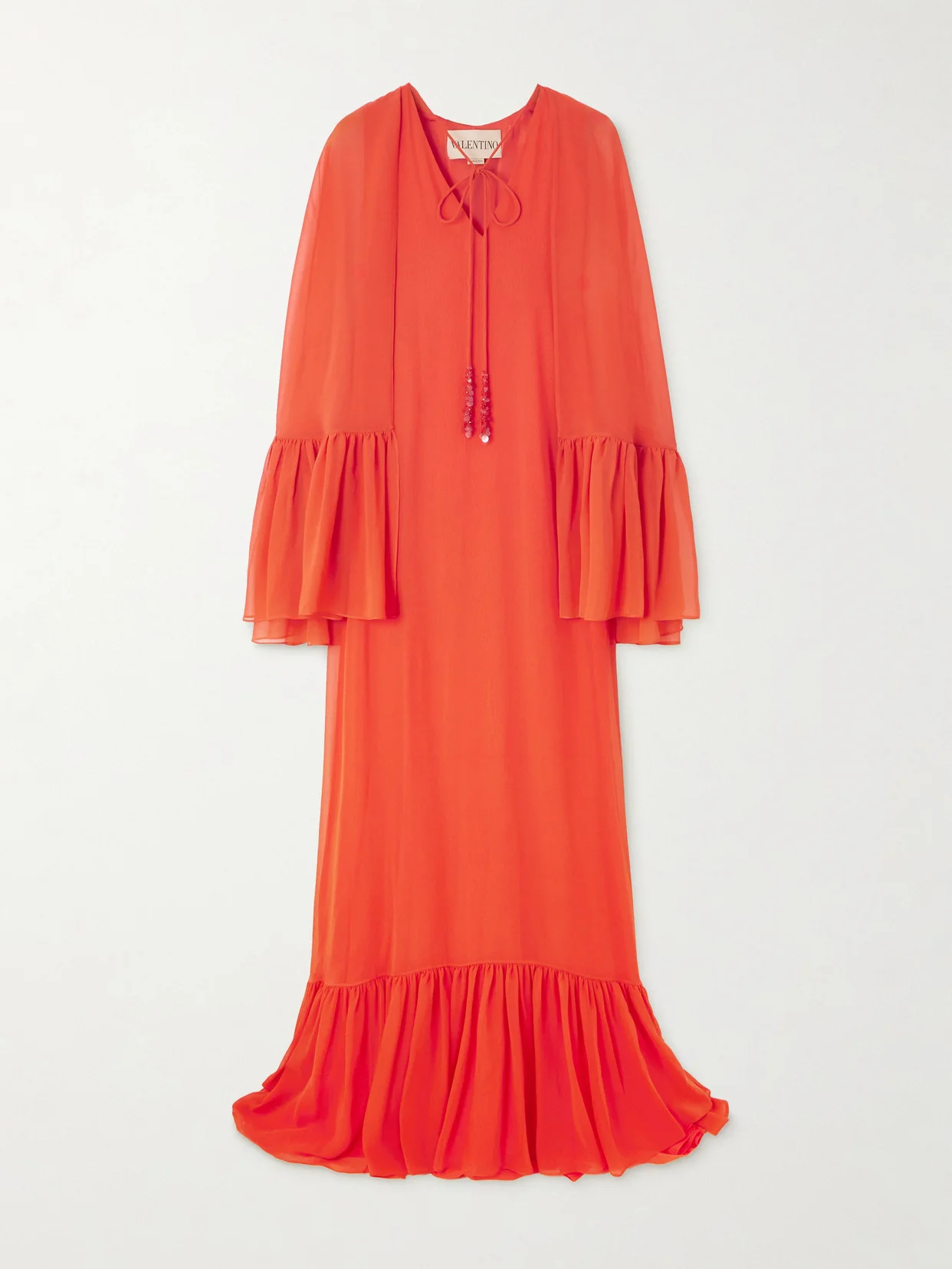 Valentino Garavani's gown is cut from lightweight silk-georgette in a loose shape that flows beautifully with every step. It has a pretty ruffled hem and a cape with ties at the front that are tipped with sparkling beads and sequins.