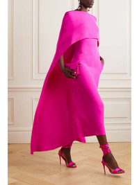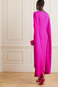 EDITORS'NOTES Valentino Garavani's now-signature shade of fuchsia is unmistakable – it enhances the regal silhouette of this midi dress so beautifully. Cut from silk-crepe in a slim shape, it's overlaid with a graceful cape that will billow as you walk. Statement jewelry and heels will make your outfit feel even more special. SIZE & FIT - Fits large to size, take one size smaller than normal - Designed for a slim fit - Loose overlay - Mid-weight, fluid, non-stretchy fabric - Model is 177cm/ 5'10" and is wearing an IT 38 DETAILS & CARE - Fuchsia silk-crepe - Concealed hook and zip fastening at back - 100% silk - Dry clean - Designer color: Pink PP Large to size. See Size & Fit notes.
