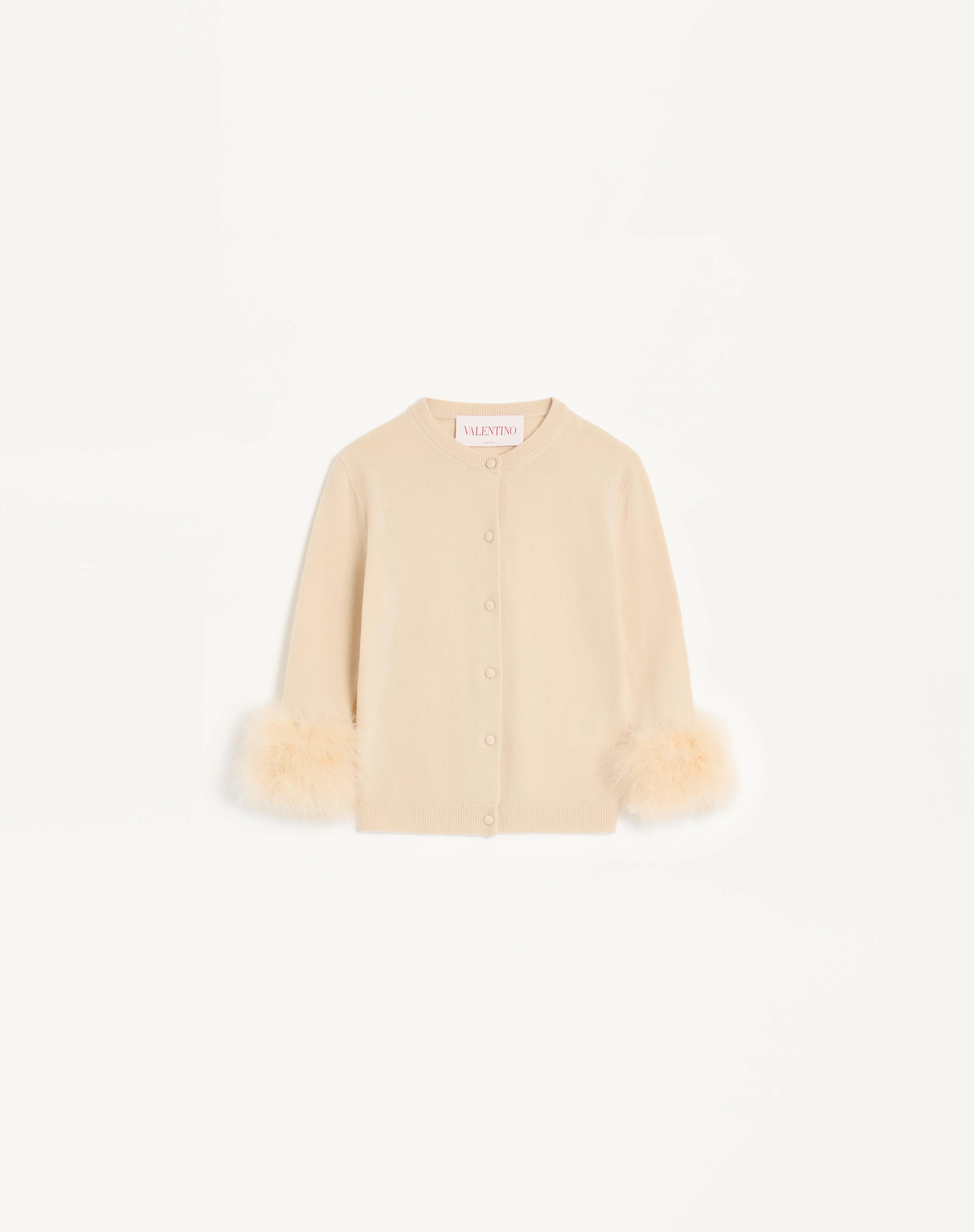 Cardigan with feather boa detail at the cuffs - Front button closure - Virgin wool (100% virgin wool) - Length: 56 cm / 22 in. from the shoulders in an Italian size S - The model is 176 cm / 5'9" tall and wears an Italian size S - Made in Italy The look of the model is completed by a Valentino Garavani Viva Superstar Bag and Valentino Garavani Valet Du Roi Shoes. Product code: 6B0KA11L9DR_ET5