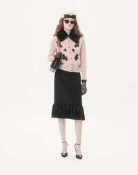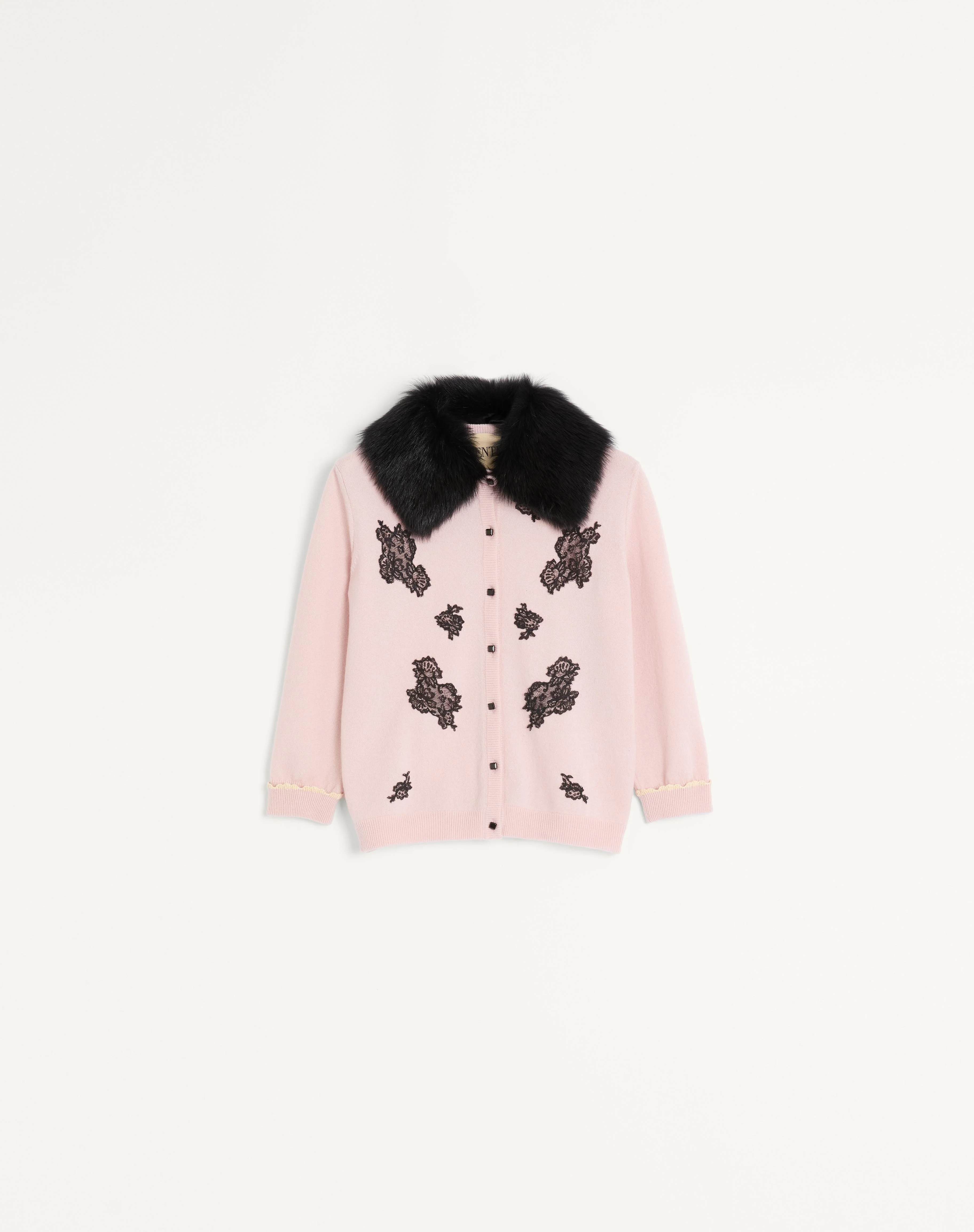 Cardigan with lace inserts and shearling collar - Removable shearling collar - Front button closure - Wool (100% Virgin Wool) - Length: 54 cm / 21.3 in. from the shoulders in an Italian size S - The model is 176 cm / 5'9" tall and wears an Italian size S - Made in Italy The look of the model is completed by a Valentino Garavani Vain Bag and Valentino Garavani Hi Dolly Shoes. Product code: 7B3KA12U9K8_ALD