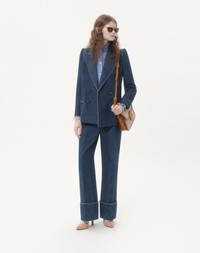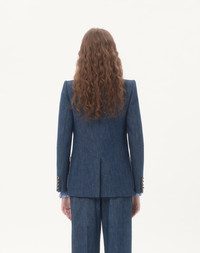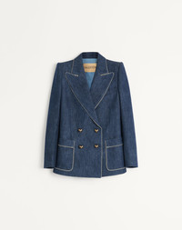 Chambray Denim Jacket - Front closure with VLogo buttons - Double-breasted - Chambray Denim (100% Cotton) - Crepe De Chine Diagonal Stripe VLogo Lining (75% Acetate, 25% Silk) - Length: 67 cm / 26.4 in. from the shoulders in an Italian size 40 - The model is 176 cm / 5'9" tall and wears an Italian size 40 - Made in Italy The look of the model is completed by a Valentino Garavani 9TO5 Bag and Valentino Garavani Hi Dolly Shoes. Product code: 7B3DC4629AG_CK8