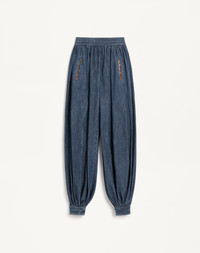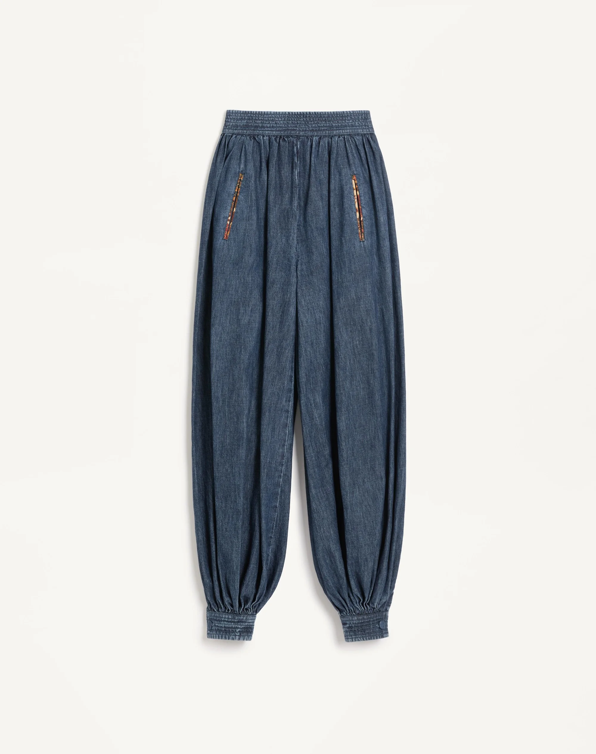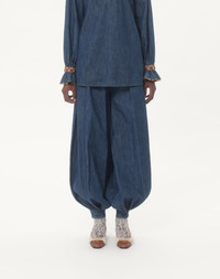 Denim Chambray balloon pants with printed fabric border detail - Multi-stitching detail on waistband and leg opening - Denim Chambray (100% Cotton) - Length: 105 cm / 43.3 in. from the waist in an Italian size 40 - Leg opening: 11 cm / 4.3 in. in an Italian size 40 - The model is 176 cm / 5'9" tall and wears an Italian size 40 - Made in Italy The look of the model is completed by a Valentino Garavani 9TO5 Bag and Valentino Garavani Valet Du Roi Shoes. Product code: 6B0DD19L7MR_558