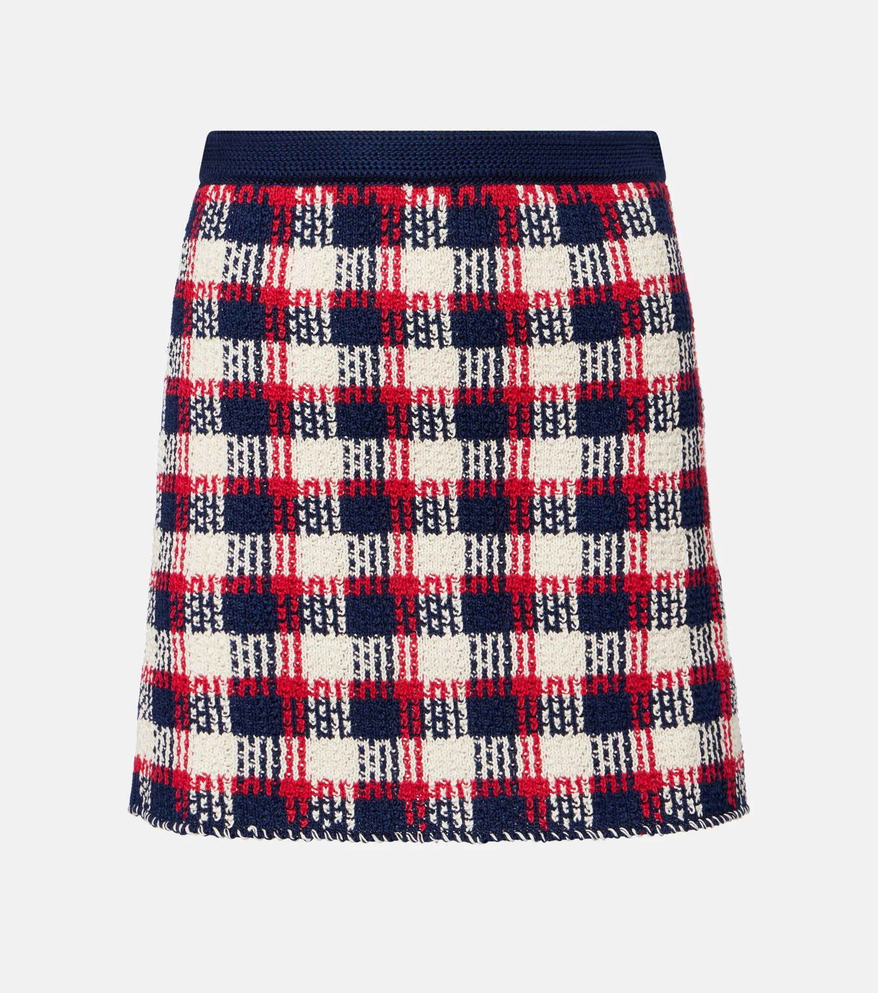 Knitted from cotton, this Valentino miniskirt features a striking checked pattern and a zip closure at the side. The maison brings its refined Italian craftsmanship to this piece, offering timeless elegance with a modern edge. Product Details - Material: 100% cotton - Care instructions: dry clean - Made in Italy - Designer color name: Navy/Paris/Betulla - Item color: blue, white, red - Closure: zipped side - Unlined - Item number: P01096392 Size & Fit - True to size - Slightly stretchy fabric - High-waisted - The model seen in the picture is 178cm-5'10" and wearing a size XS