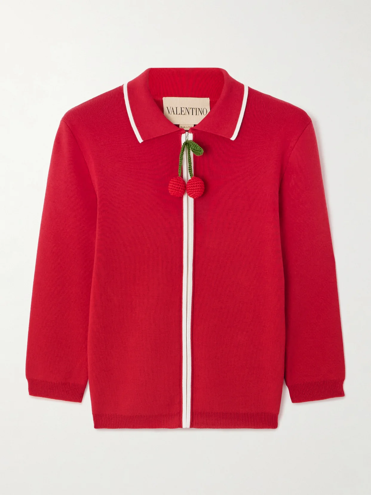 From the vibrant red shade to the pair of cherries dangling from the zipper, Valentino Garavani's cardigan is a sweet statement piece with a whimsical twist. It's made from cotton and has a relaxed shape defined by contrasting trims.