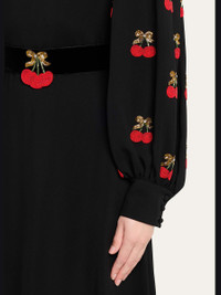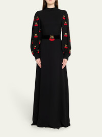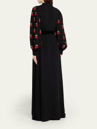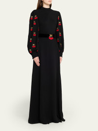 Cherry Embroidered Belted Puff-Sleeve Gown