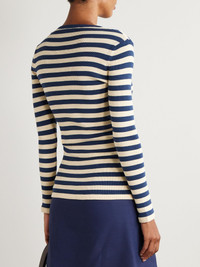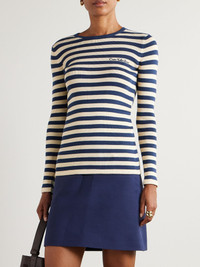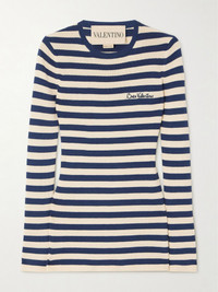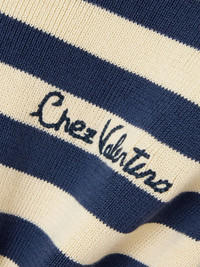 Valentino Garavani's sweater is embroidered with 'Chez Valentino' cursive lettering at the chest. Made from cotton, it's patterned with nautical stripes and has a slim fit. We think it looks especially chic tucked into tailored shorts. Size & Fit - Fits true to size, take your normal size - Designed for a slim fit - Mid-weight knit - Model is 177cm/ 5'10" and is wearing a size Small Model measurements: - Bust: 86cm/ 34" - Waist: 65cm/ 25.5" - Hip: 90cm/ 35.5" Details & Care - Navy and cream cotton - Slips on - 100% cotton - Dry clean