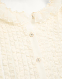 Short-sleeved chiffon shirt - Micro ruffle detail on body and neck - Front button closure - Chiffon (100% Silk) - Unlined - Length: 60 cm / 23.6 in. from the shoulders in an Italian size 40 - Sleeve length: 42.5 cm / 16.7 in. from the center back in an Italian size 40 - The model is 176 cm / 5'9" tall and wears an Italian size 40 - Made in Italy The look of the model is completed by a Valentino Garavani Vain Bag and Valentino Garavani Ladycrush Shoes. Product code: 6B3AA0A52UP_0X2