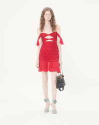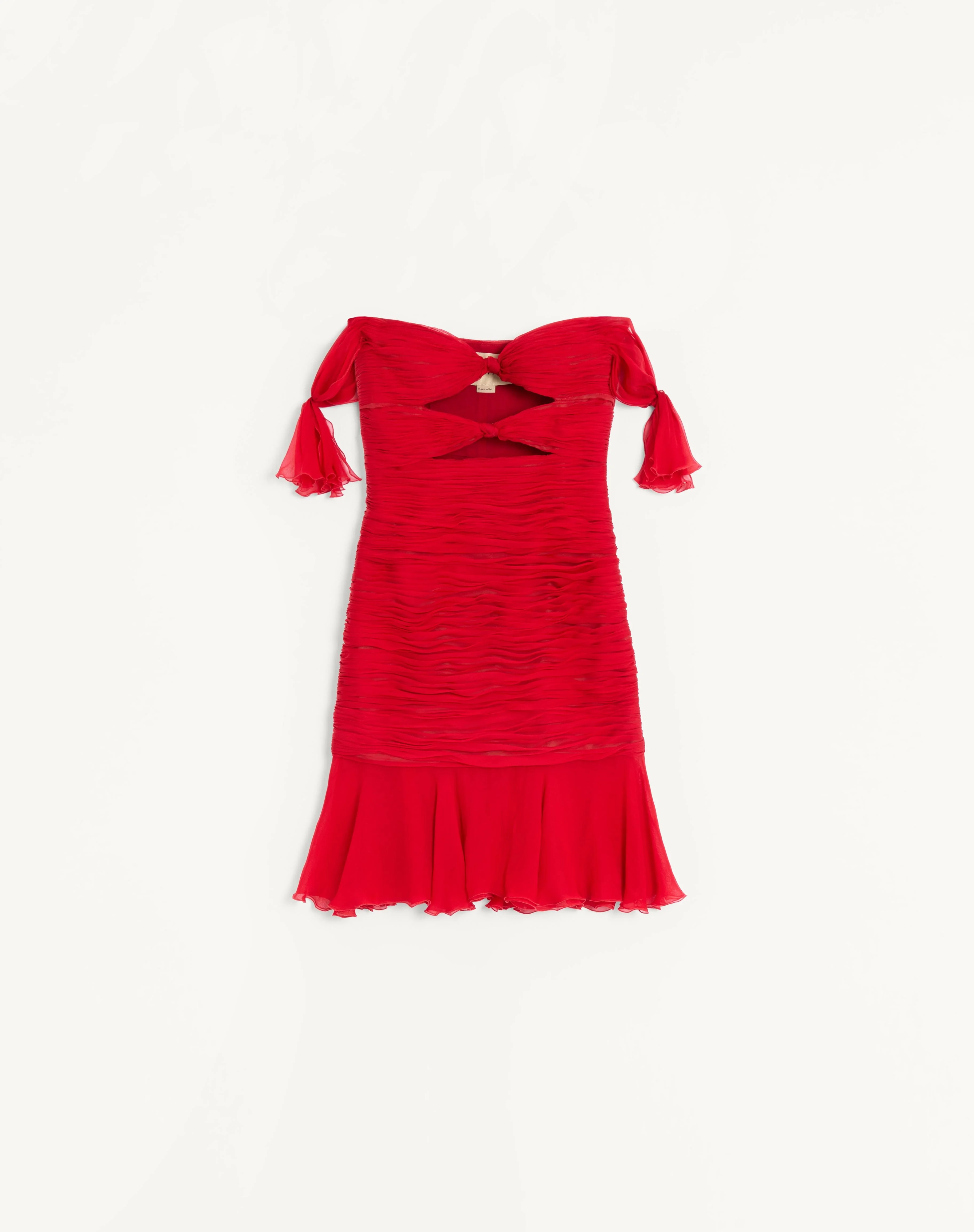 Short Chiffon dress with handmade draping - Flounce at the bottom - Side zipper and hook-and-eye closure - Chiffon (100% Silk) - Georgette Stretch lining (91% Viscose, 9% Elastane) - Length: 90 cm / 35.4 in. from the shoulders in an Italian size 40 - The model is 176 cm / 5'9" tall and wears an Italian size 40 - Made in Italy Product code: 8B3VAJ612UP_R9M