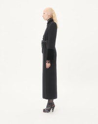 Compact Drap coat with Faille bow - Velvet details - Ruching detail - Shoulder pads - Front closure with snap buttons - Compact Drap (90% Virgin Wool, 10% Cashmere - Flower, Stripes and VLogo lining (74% Acetate, 26% Silk) - Length: 140 cm / 55.1 in. from the shoulders in an Italian size 40 - The model is 176 cm / 5'9" tall and wears an Italian size 40 - Made in Italy The look of the model is completed by Valentino Garavani Dans Le Foyer Shoes. Product code: 7B0CA8056JA_0NO