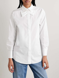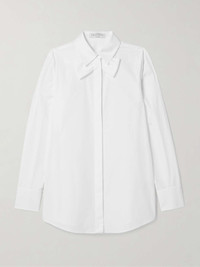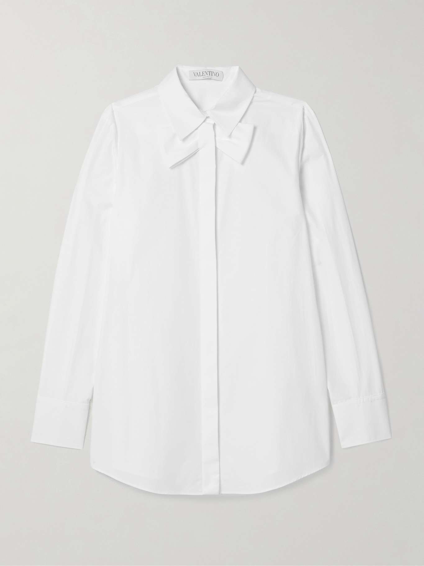 EDITORS'NOTES Valentino Garavani's shirt is designed to look like a tonal bowtie sits beneath the collar, and you don't even have to fuss with fastening it correctly. Made in Italy from crisp cotton-poplin, it has a loose fit and concealed placket for a streamlined finish. SIZE & FIT Model measurements: - Fits true to size, take your normal size - Tailored for a loose fit - Lightweight, non-stretchy fabric - Model is 183cm/ 6'0" and is wearing an IT 40 - Bust: 79cm/ 31" - Waist: 61cm/ 24" - Hip: 85cm/ 35.5" DETAILS & CARE - White cotton-poplin - Concealed button fastenings through front - 100% cotton - Dry clean