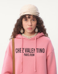 Cotton sweatshirt with hood and Chez Valentino print - Chez Valentino print - Loose fit - Hood with drawstring - Cotton (100% Cotton) - Length: 70 cm / 27.5 in. from the shoulders in an Italian size S - Sleeve length: 84 cm / 33 in. from the center back in an Italian size S - The model is 176 cm / 5'9" tall and wears an Italian size S - Made in Italy The look of the model is completed by a Valentino Garavani Nellcote Bag and Valentino Garavani Bay By Bay Shoes. Product code: 6B3MF24D960_259