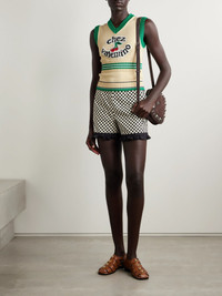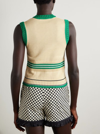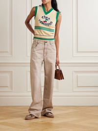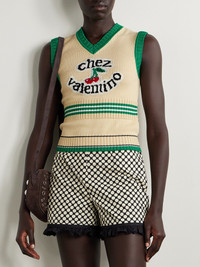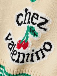 Valentino Garavani’s vest is intarsia-knitted with the words 'chez Valentino' and a playful cherry at the chest. It's made from mid-weight cotton and has striped ribbed trims. Wear it solo or layered over crisp shirting. Size & Fit - Fits true to size, take your normal size - Designed for a close fit - Mid-weight knit - Model is 177cm/ 5'10" and is wearing a size XSmall Model measurements: - Bust: 81cm/ 32" - Waist: 62cm/ 24.5" - Hip: 89cm/ 35" Details & Care - Multicolored cotton - Slips on - 100% cotton - Dry clean