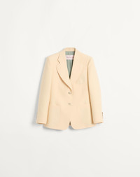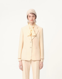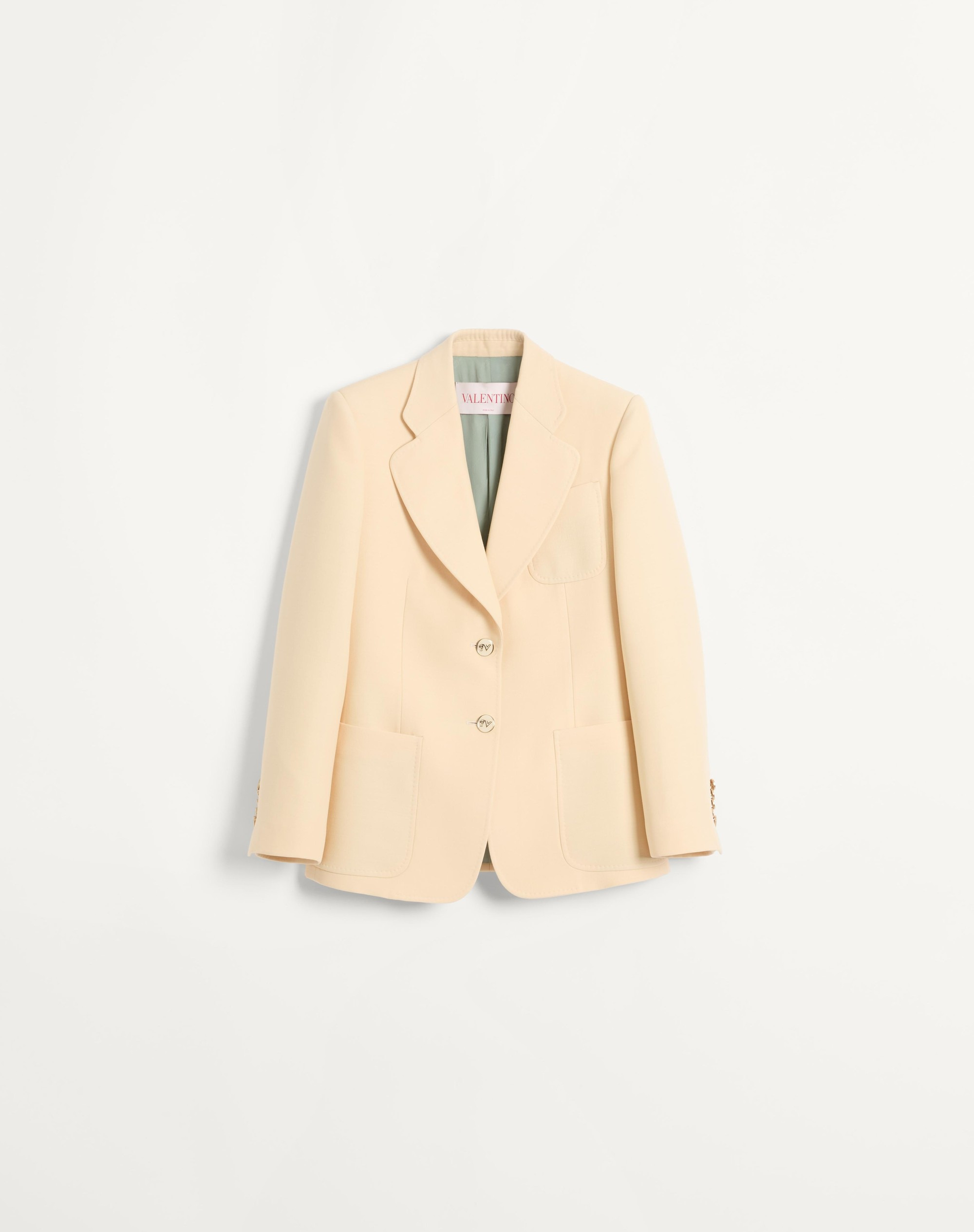 Crepe Couture Blazer - Full canvas construction - Panther VLogo button front closure - Crepe Couture (65% Virgin Wool, 35% Silk) - Crepe de Chine V Logo lining (75% Acetate, 25% Silk) - Length: 64 cm / 25.1 in. from the shoulders in an Italian size 40 - Sleeve length: 77 cm / 30.3 in. from the center back in an Italian size 40 - The model is 176 cm / 5'9" tall and wears an Italian size 40 - Made in Italy The look of the model is completed by a Valentino Garavani VSLING Bag and Valentino Garavani Bowow Shoes. Product code: 6B3CE4101CF_ET5