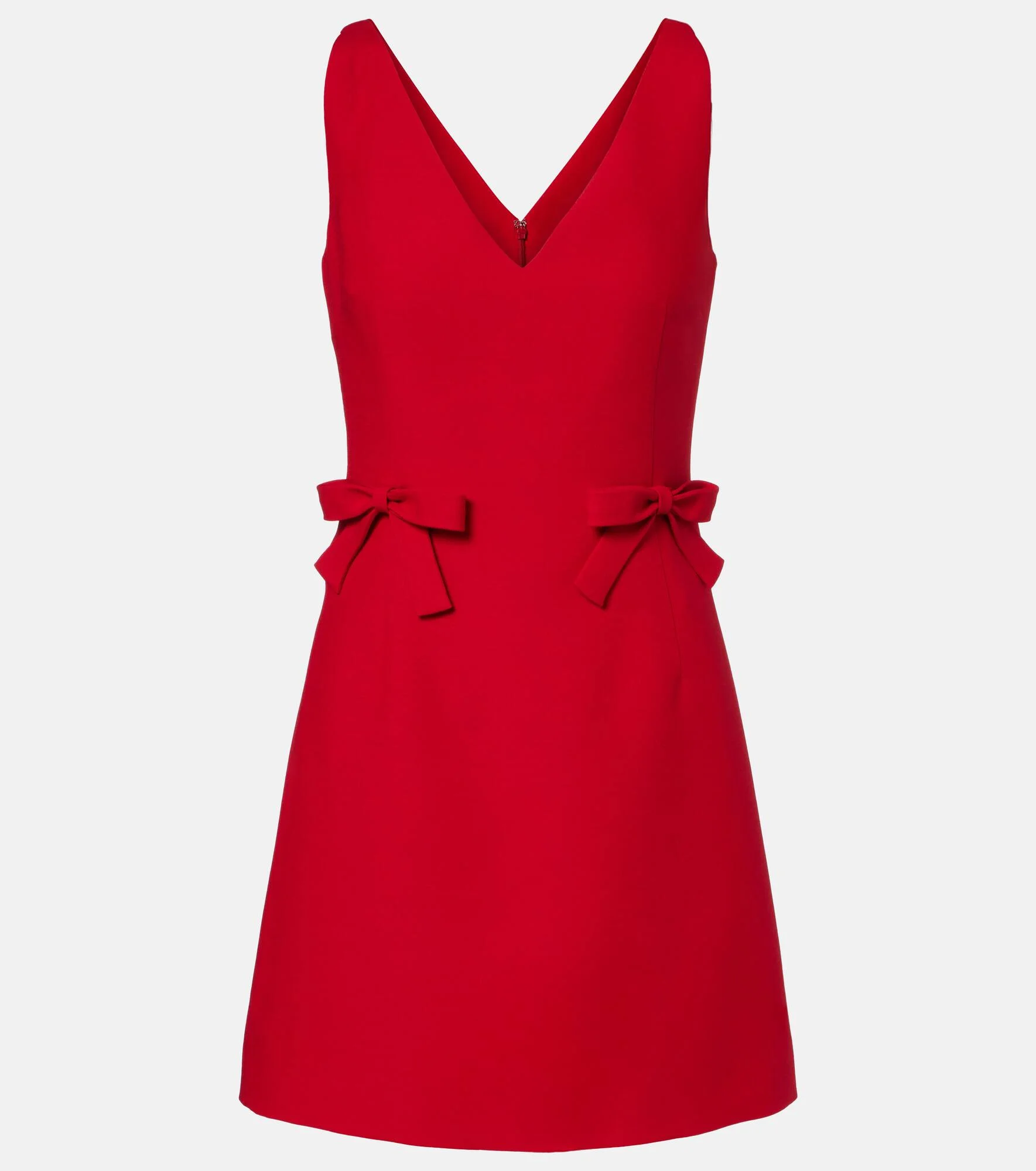 Valentino has become a symbol of crafting excellence, creativity, and uniqueness. This minidress exudes sophistication with its front bow details and is crafted from the signature Crepe Couture fabric, a luxurious wool and silk blend. Product Details - Material: 65% wool, 35% silk - Care instructions: dry clean - Made in Italy - Color: red - Designer color name: Paris - Lining: 91% silk, 9% elastane - Trim: 65% wool, 35% silk - Closure: concealed zipped back - Item number: P01108327 Size & Fit - Fits large to size - we recommend trying one size smaller - Low back - Cinched waist - Non-stretchy fabric - The model seen in the picture is 178cm-5'10" and wearing a size IT 38