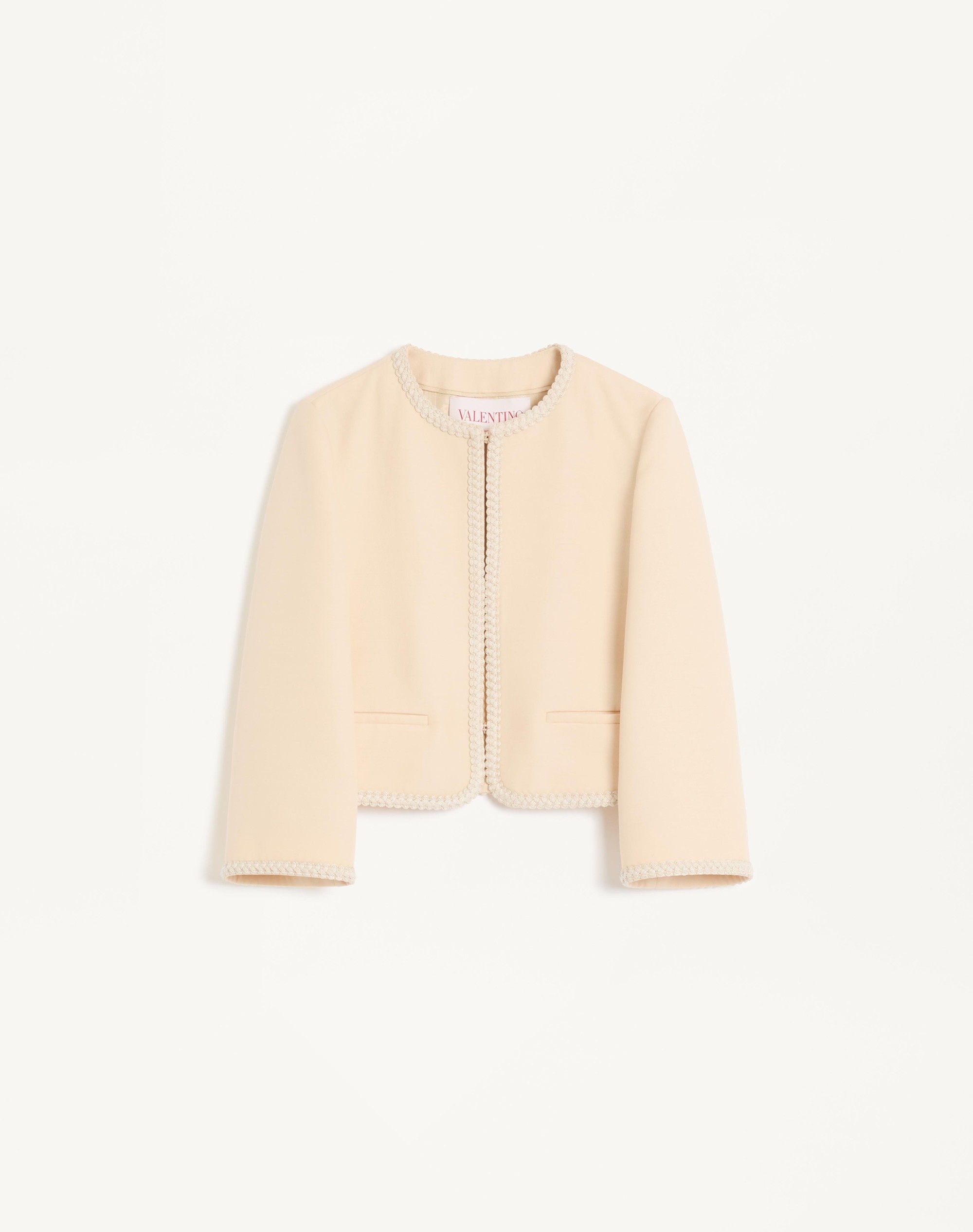 Crepe Couture jacket with passementerie trim detail - Hook-and-eye front closure - Crepe Couture (65% Virgin Wool, 35% Silk) - Flower and V Logo Stripes lining (100% Viscose) - Length: 48.5 cm / 19 in. from the shoulders in an Italian size 40 - The model is 176 cm / 5'9" tall and wears an Italian size 40 - Made in Italy Product code: 6B0CE4L51CF_ET5