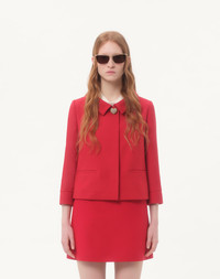 Crepe Couture jacket - Jewel button detail - Front closure with lined press studs - Crepe Couture (65% Virgin Wool, 35% Silk) - Viscose lining (100% Viscose) - Length: 51 cm / 20.1 in. from the shoulders in an Italian size 40 - Sleeve length: 70 cm / 27.6 in. from the center back in an Italian size 40 - The model is 176 cm / 5'9" tall and wears an Italian size 40 - Made in Italy The look of the model is completed by a Valentino Garavani Viva Superstar Bag and Valentino Garavani Adamantine Shoes. Product code: 7B3CE3Y01CF_R9M