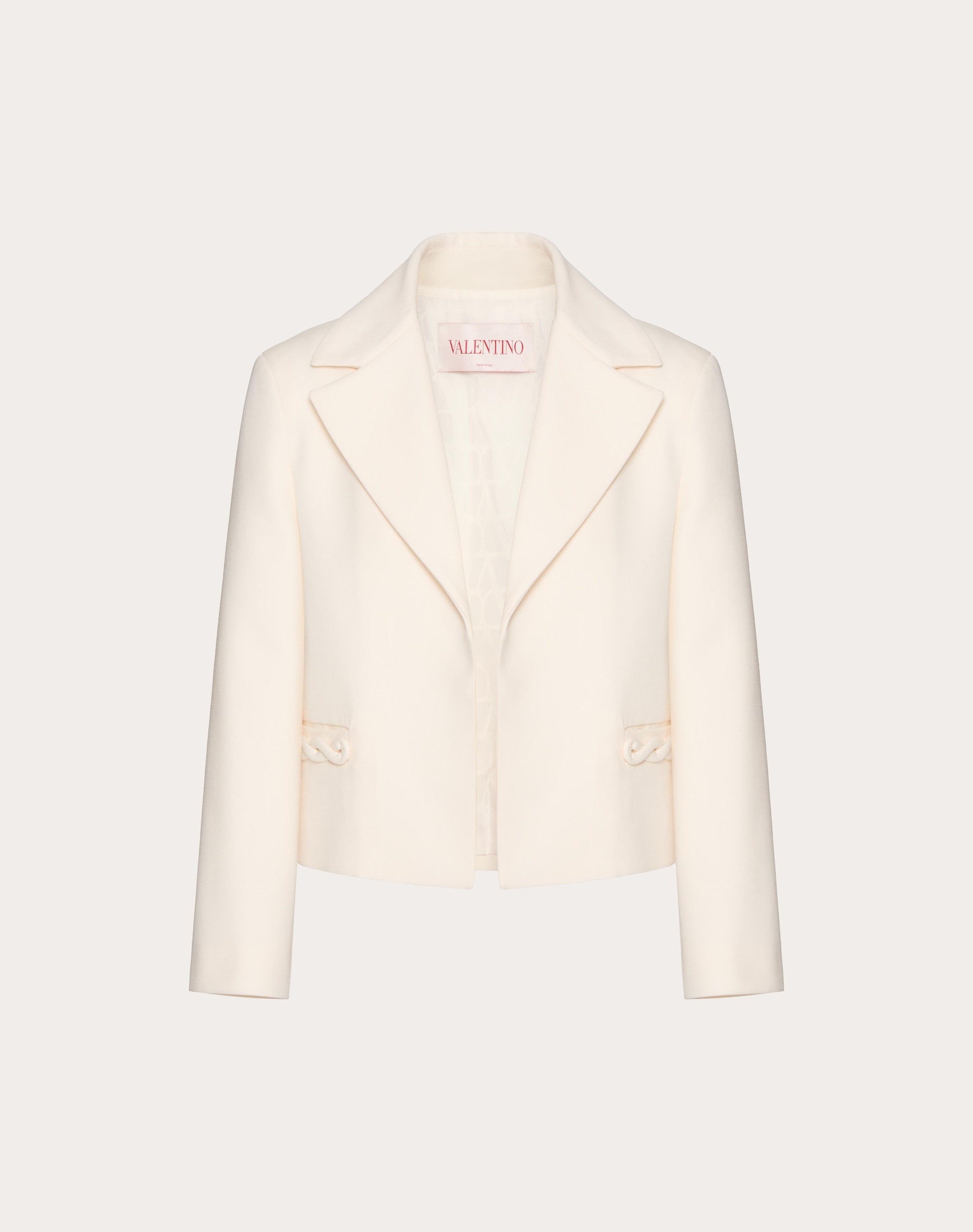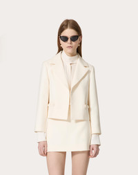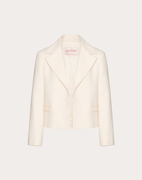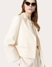Crepe Couture Jacket - Braid detail - Crepe Couture (65% Virgin Wool, 35% Silk) - Saglia Gino lining (100% Cupro) - Length: 51 cm / 20.1 in. from the shoulders in an Italian size 40 - Sleeve length: 72.5 cm / 28.5 in. from the center back in an Italian size 40 - The model is 176 cm / 5'9" tall and wears an Italian size 40 - Made in Italy The look of the model is completed by a Valentino Garavani Alltime Bag and Valentino Garavani VLogo Locker Shoes. Product code: 5B3CE2I01CF_A03