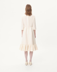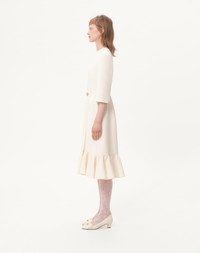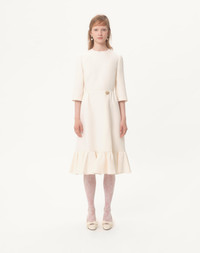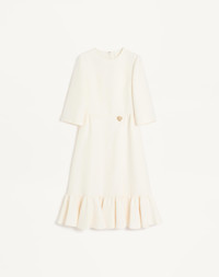 Crepe Couture midi dress with Heart jewel button - - Ruffled hem - Rear zipper closure - Crepe Couture (65% Virgin Wool, 35% Silk) - Habotai lining (100% Silk) - Length: 110 cm / 43.3 in. from the shoulders in an Italian size 40 - The model is 176 cm / 5'9" tall and wears an Italian size 40 - Made in Italy The look of the model is completed by a Valentino Garavani Bag and Valentino Garavani Bowow Shoes. Product code: 7B3VADV01CF_A03
