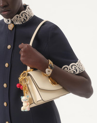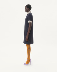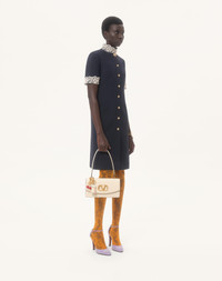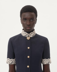 Crepe Couture midi dress with Macrame trim - Front closure with jeweled buttons - Crepe Couture (65% Virgin Wool, 35% Silk) - Habotai lining (100% Silk) - Length: 100 cm / 39.4 in. from the shoulders in an Italian size 40 - The model is 176 cm / 5'9" tall and wears an Italian size 40 - Made in Italy The look of the model is completed by a Valentino Garavani Vain Bag and Valentino Garavani Hi Dolly Shoes. Product code: 7B3VAG101CF_R7D