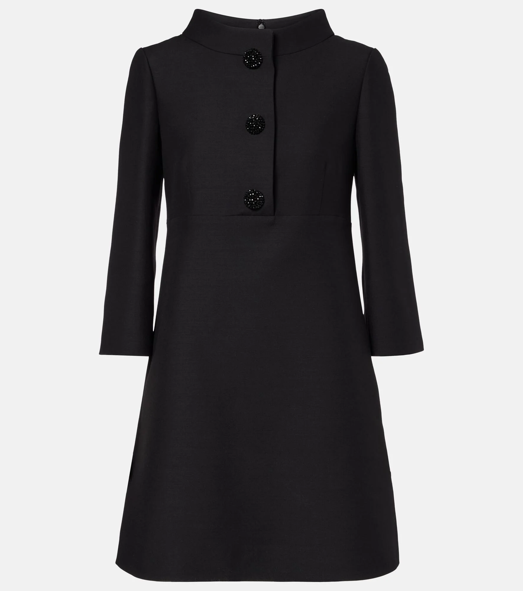 Crafted in Italy from brand-signature Crepe Couture, this minidress from Valentino features a structured, A-line silhouette. The elegant design features a half-buttoned front and a scoop neckline for a refined touch. Product Details - Material: 65% wool, 35% silk - Care instructions: dry clean - Made in Italy - Designer color name: Nero - Item color: black - Lining: 100% silk - Collar: band - Pockets: side slit pockets - Closure: partially buttoned front, concealed zipped back - Item number: P01108249 Size & Fit - True to size - Cinched waist - Non-stretchy fabric - The model seen in the picture is 178cm-5'10" and wearing a size IT 40