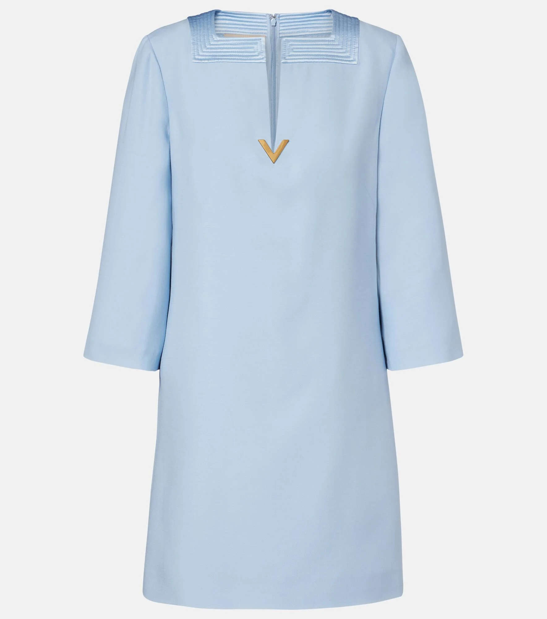 Valentino's signature Crepe Couture fabric – a luxurious wool and silk blend – provides structure and a beautiful drape. Made from the iconic material, this chic minidress will easily slot into your rotation. Product Details - Material: 65% wool, 35% silk - Care instructions: dry clean - Made in Italy - Color: blue - Designer color name: Dusty Blue - Material II: 100% silk - Lining: 100% silk - Hardware color: gold - Closure: concealed zipped back, hook fastening - Item number: P01108268 Size & Fit - True to size - Straight fit - Non-stretchy fabric - The model seen in the picture is 178cm-5'10" and wearing a size IT 40