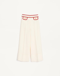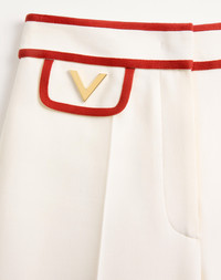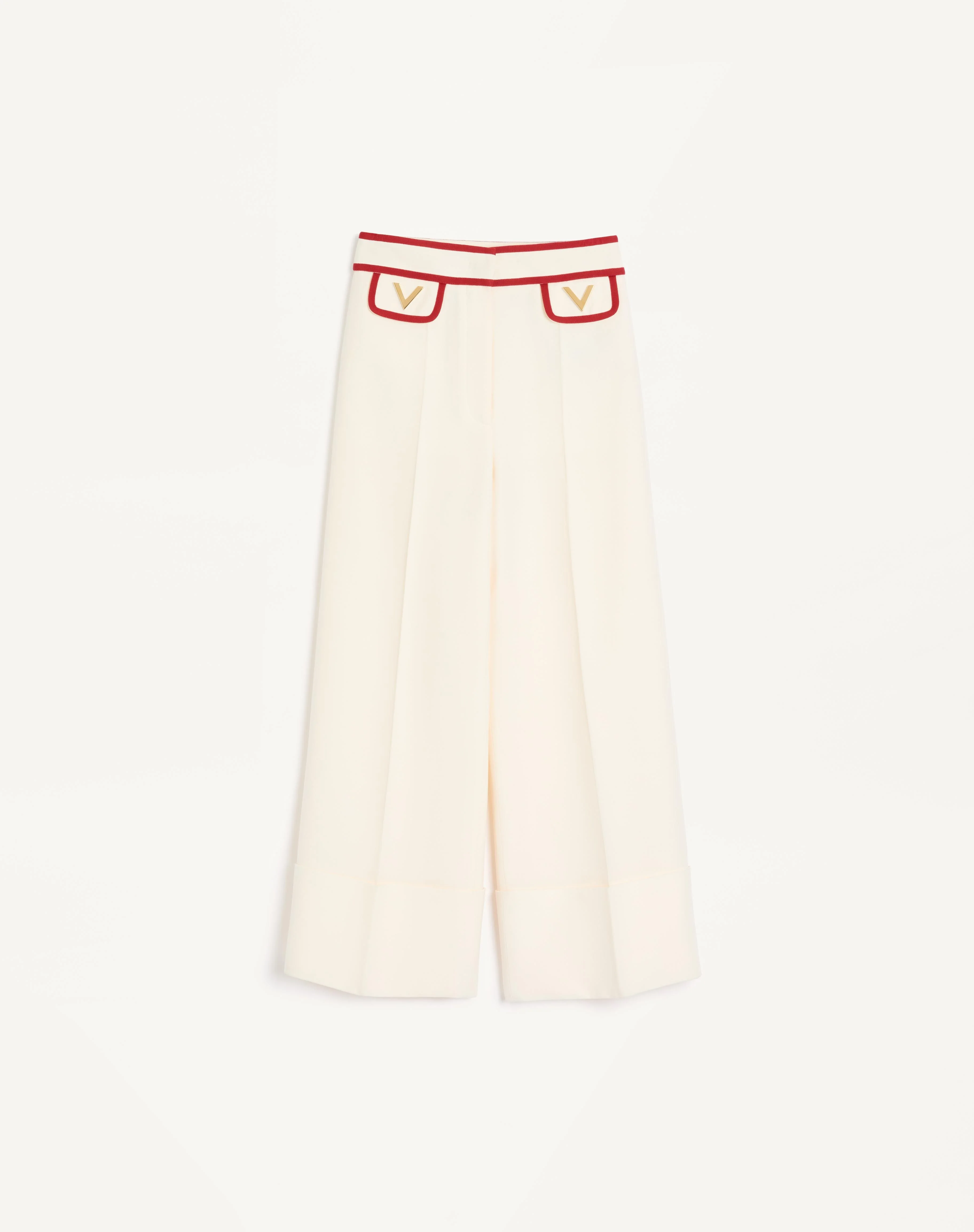 Crepe Couture Pants with V Gold - Turn-ups - Side fastening with zipper and hook - Crepe Couture (65% Virgin Wool, 35% Silk) - Habotai lining (100% Silk) - Length: 96 cm / 37.7 in. from the waist in an Italian size 40 - Leg opening: 31.5 cm / 12.4 in. in an Italian size 40 - The model is 176 cm / 5'9" tall and wears an Italian size 40 - Made in Italy The look of the model is completed by a Valentino Garavani Viva Superstar Bag and Valentino Garavani Fawcette Shoes. Product code: 7B3RB6541CF_AS0