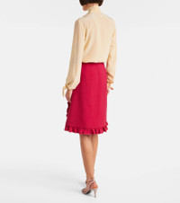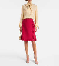 Valentino's signature Crepe Couture fabric – a luxurious wool and silk blend – provides structure and a beautiful drape. This midi skirt is finished with ruffles for a romantic touch. Product Details - Material: 65% wool, 35% silk - Care instructions: dry clean - Made in Italy - Designer color name: Crystal Red - Item color: red - Material II: 100% silk - Lining: 100% silk - Closure: zipped back - Short vent - Fully lined - Item number: P01059881 Size & Fit - True to size - Non-stretchy fabric - The model seen in the picture is 178cm-5'10" and wearing a size IT 40