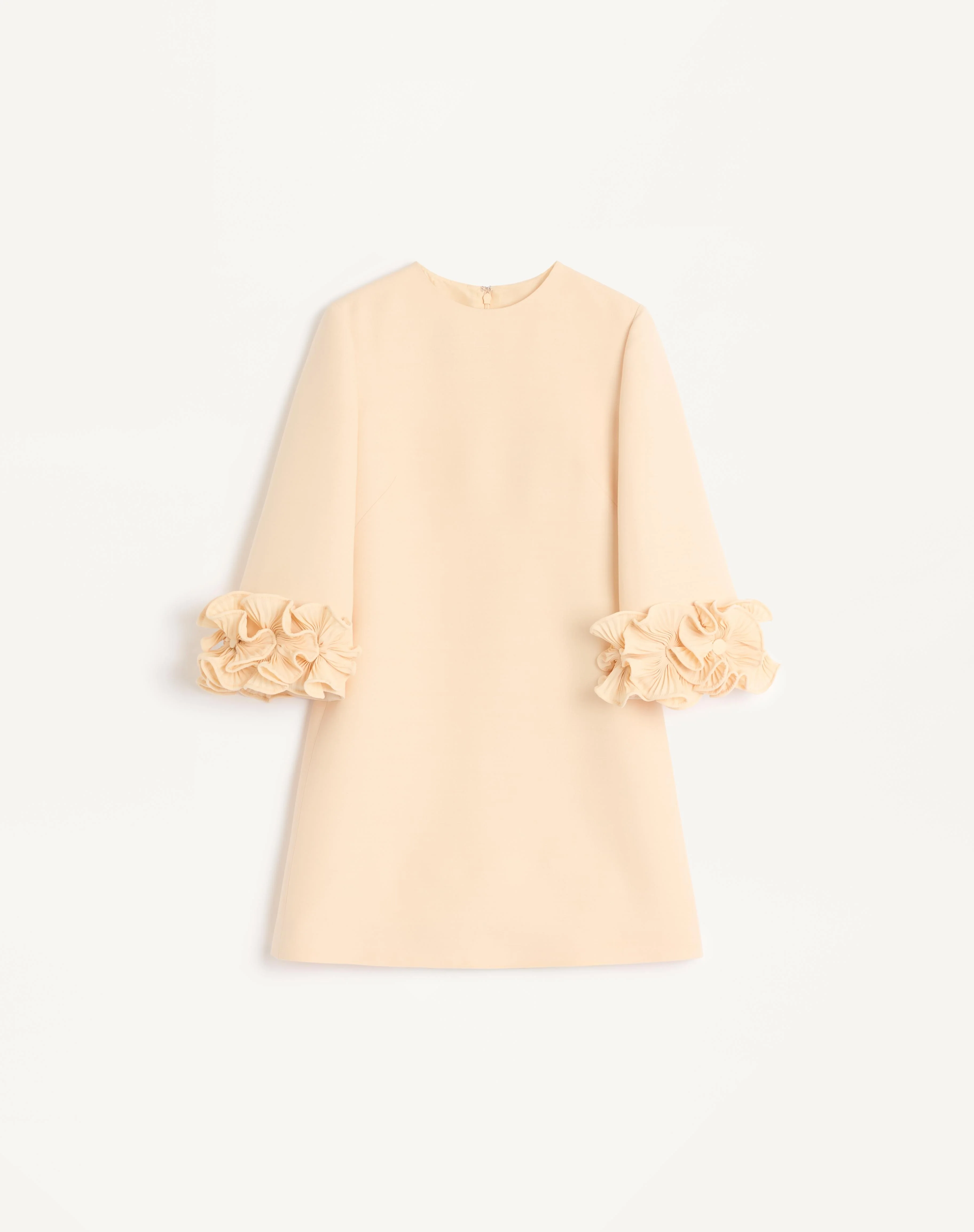 Crepe Couture short dress with pleated ruffles in Georgette - Rear zipper closure - Crepe Couture (65% Virgin Wool, 35% Silk) - Habotai lining (100% Silk) - Length: 90 cm / 35.4 in. from the shoulders in an Italian size 40 - The model is 176 cm / 5'9" tall and wears an Italian size 40 - Made in Italy The look of the model is completed by a Valentino Garavani Vain Bag and Valentino Garavani Bowow Shoes. Product code: 7B3VADX01CF_ET5