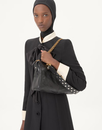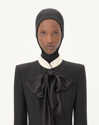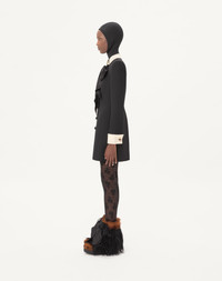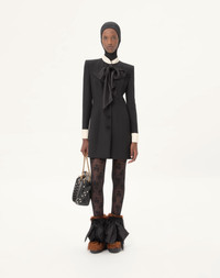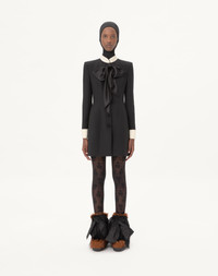Crepe Couture short dress with satin bow - Duchesse collar and cuffs - Jewel button detail on the cuffs - Shoulder pads - Front closure with soutache buttons - Crepe Couture (65% Virgin Wool, 35% Silk) - Lining with flowers, stripes, and VLogo (74% Acetate, 26% Silk) - Length: 87 cm / 34.3 in. from the shoulders in an Italian size 40 - The model is 176 cm / 5'9" tall and wears an Italian size 40 - Made in Italy The look of the model is completed by a Valentino Garavani Panthea Bag and Valentino Garavani Snowish Shoes. Product code: 7B0VAGH51CF_CFD