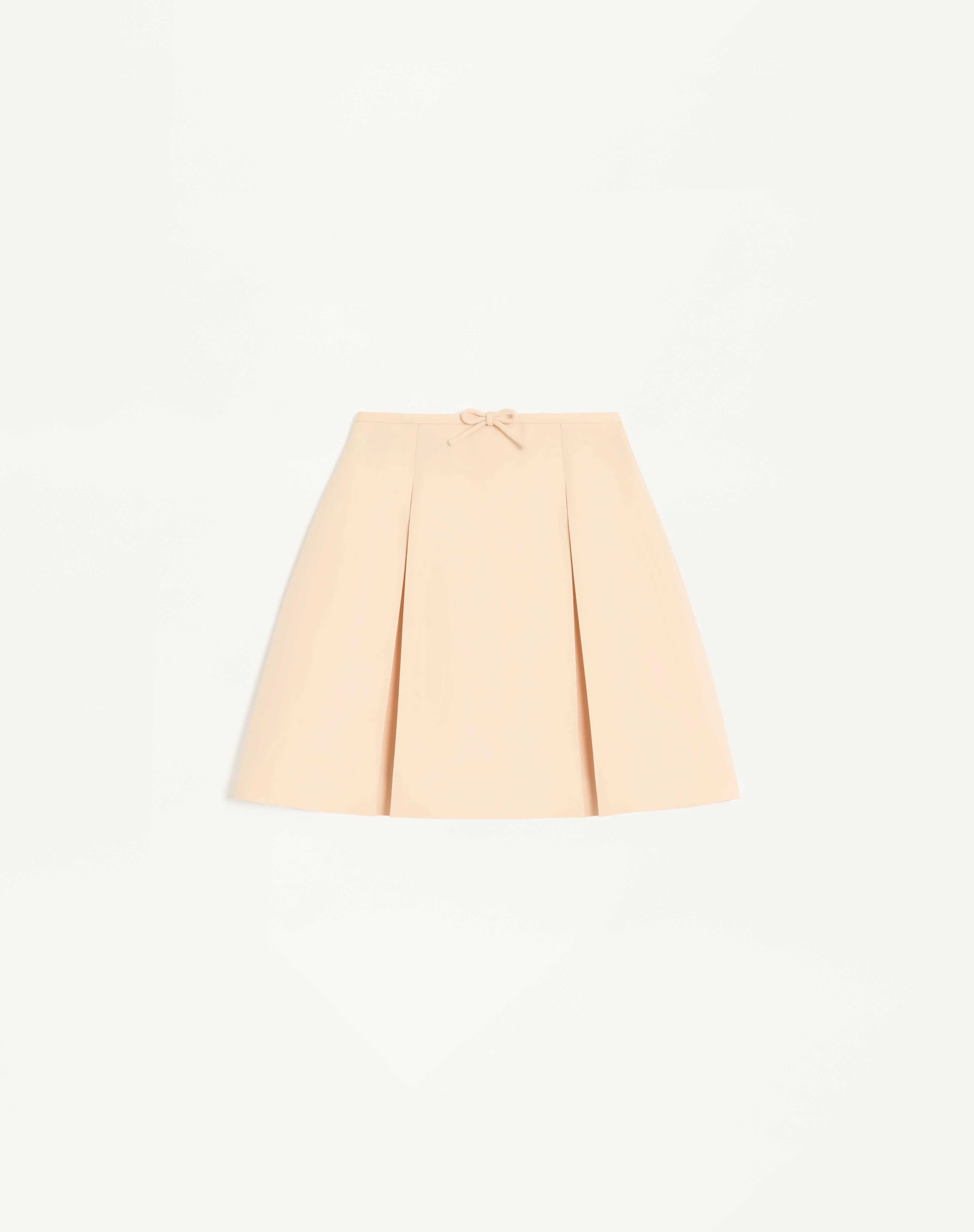 Crepe Couture short skirt with side pleats - Bow at waist - Crepe Couture (65% Virgin Wool, 35% Silk) - Habotai lining (100% Silk) - Length: 87 cm / 34.3 in. from the waist in an Italian size 40 - The model is 176 cm / 5'9" tall and wears an Italian size 40 - Made in Italy The look of the model is completed by a Valentino Garavani Nellcote Bag and Valentino Garavani Shoes. Product code: 6B0RADF51CF_ET5