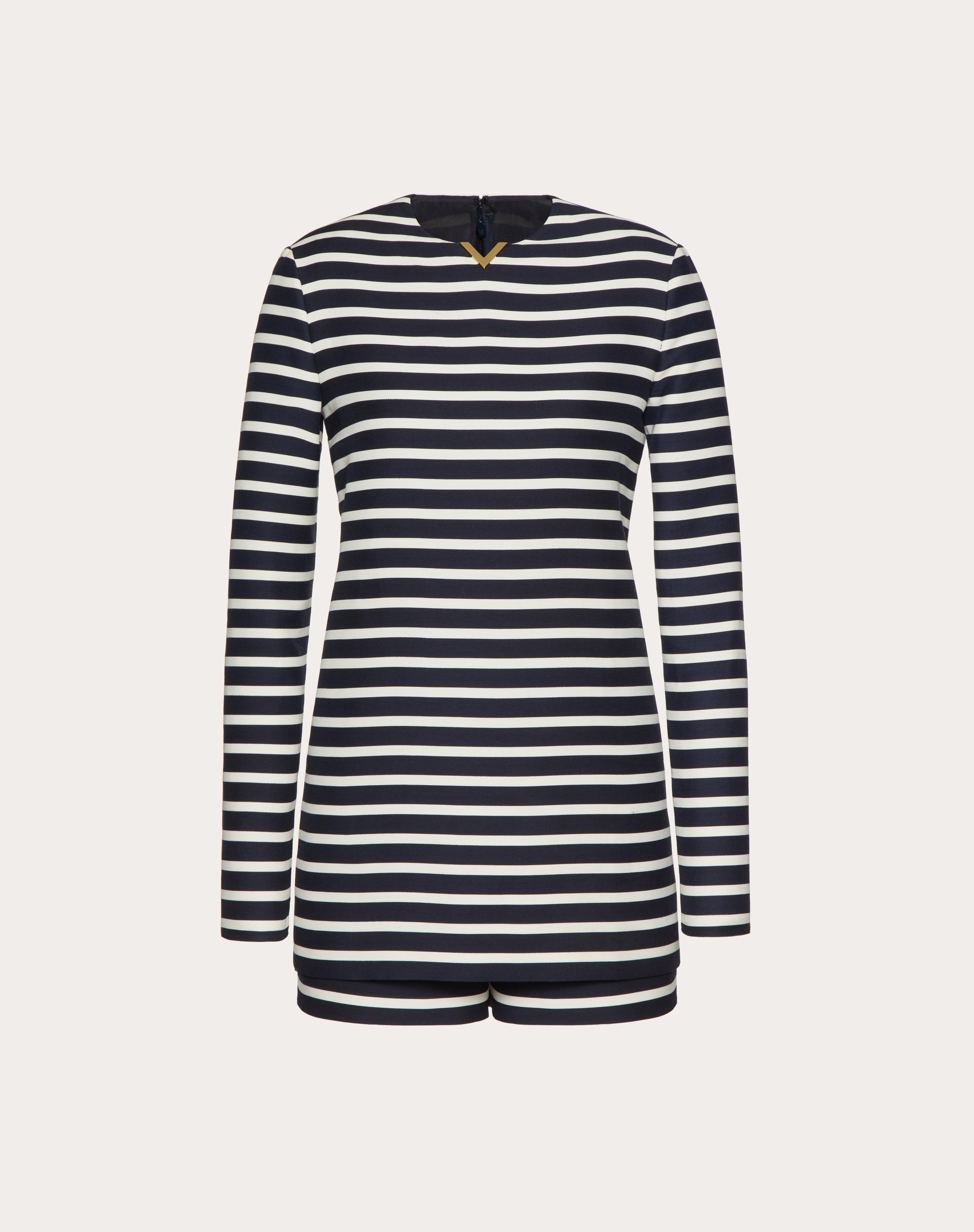 Playsuit in Crepe Couture striped print - V Gold detail on front neckline - Concealed rear zipper and hook and eye fastening - Crepe Couture (65% Virgin Wool, 35% Viscose) - Georgette Stretch lining (91% Viscose, 9% Elastane) - Length 79 cm / 31.1 in. from shoulders in Italian size 40 - Sleeve length 80 cm / 31.4 in. from the center back in Italian size 40 The model is 176 cm / 5'9" tall and wears an Italian size 40 - Made in Italy Product Code BVE2027D4_671