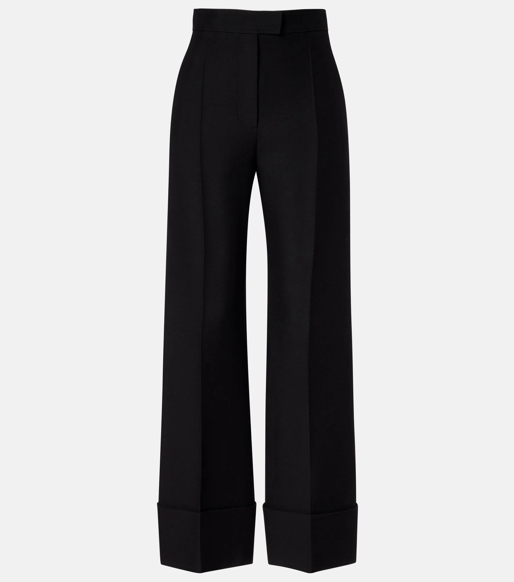 Valentino's Crepe Couture fabric – a luxurious wool and silk blend – provides structure and a beautiful drape. Crafted from the signature material, these wide-leg pants sit high at the waist and feature folded hems. Product Details - Material: 65% wool, 35% silk - Care instructions: dry clean - Made in Italy - Color: black - Designer color name: Nero - Item color: black - Pocket lining: 100% viscose - Closure: zipper fly, button and hook fastenings - Pockets: slant pockets, back pockets - Item number: P01108222 Size & Fit - Fits large to size - we recommend trying one size smaller - Sizing adapted to taller women - Non-stretchy fabric - Wide-leg - High-waisted - The model seen in the picture is 178cm-5'10" and wearing a size IT 38